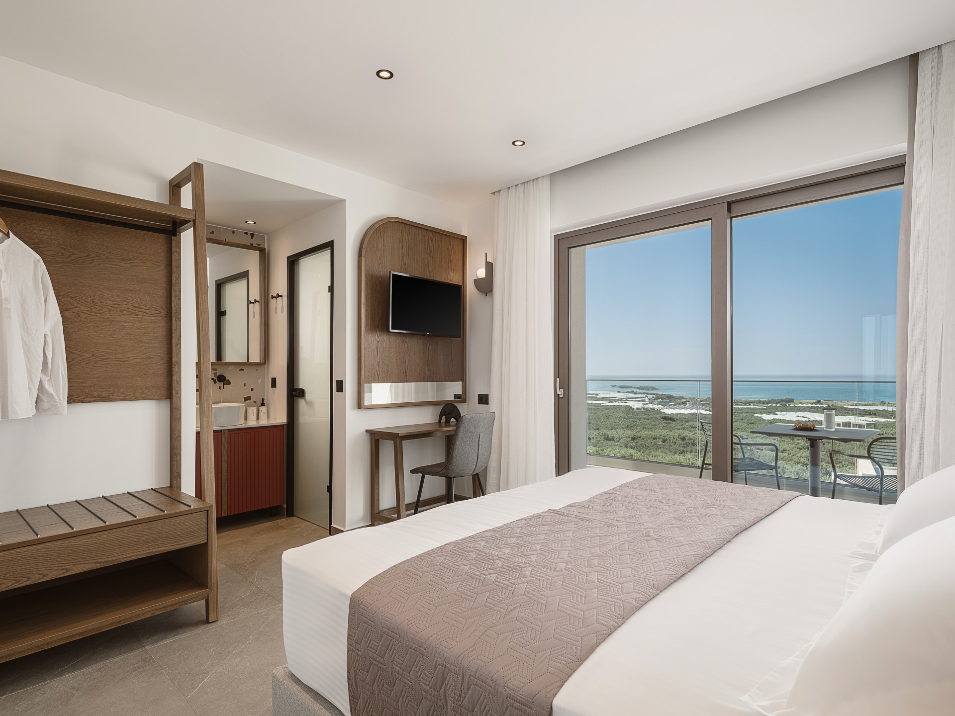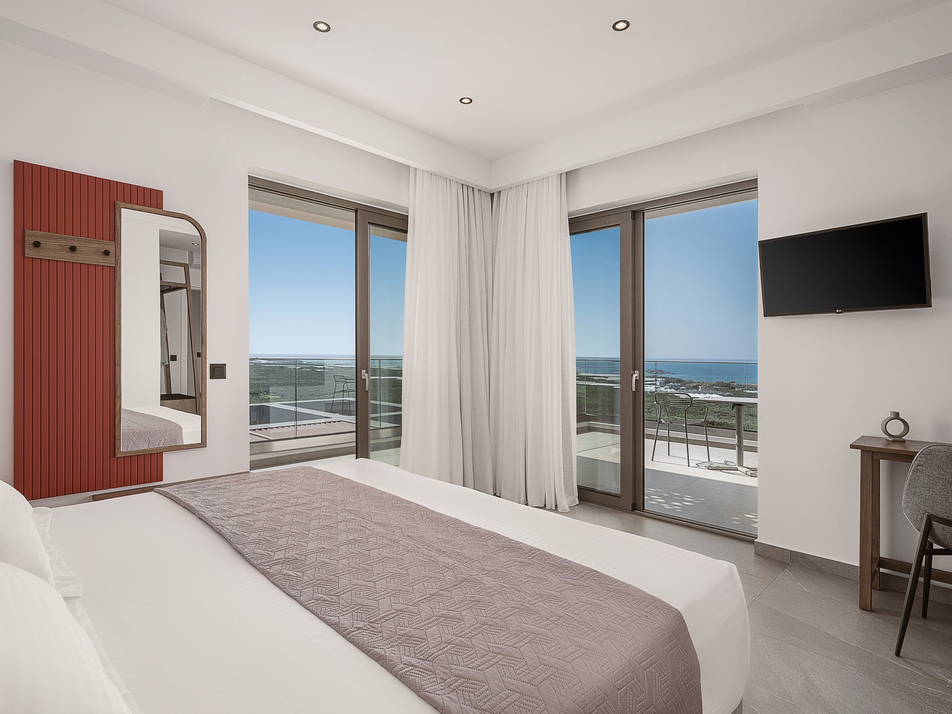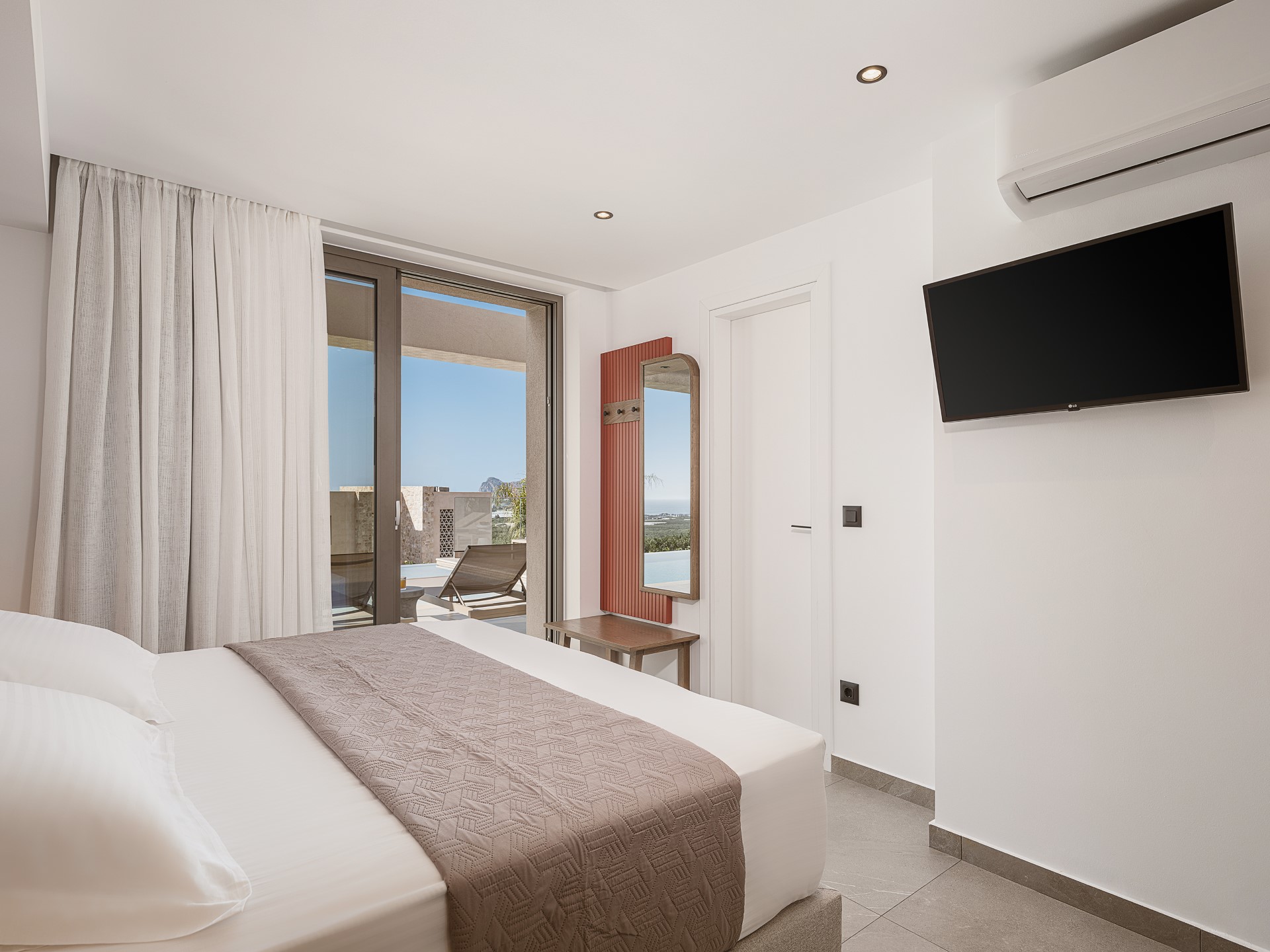 The villa features FIVE DOUBLE BEDROOMS, each designed as an INDEPENDENT SUITE. All bedrooms include EN-SUITE BATHROOMS WITH WALK-IN SHOWERS, air conditioning, wall-mounted TVs, open wardrobe areas, and dedicated desk or vanity spaces. Several bedrooms enjoy PRIVATE BALCONIES WITH SEA VIEWS, offering peaceful corners for quiet moments. An ADDITIONAL GUEST WC is available in the common areas, ensuring comfort and convenience during shared living.