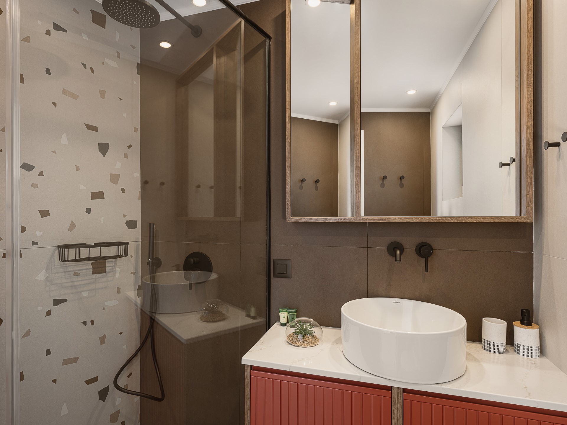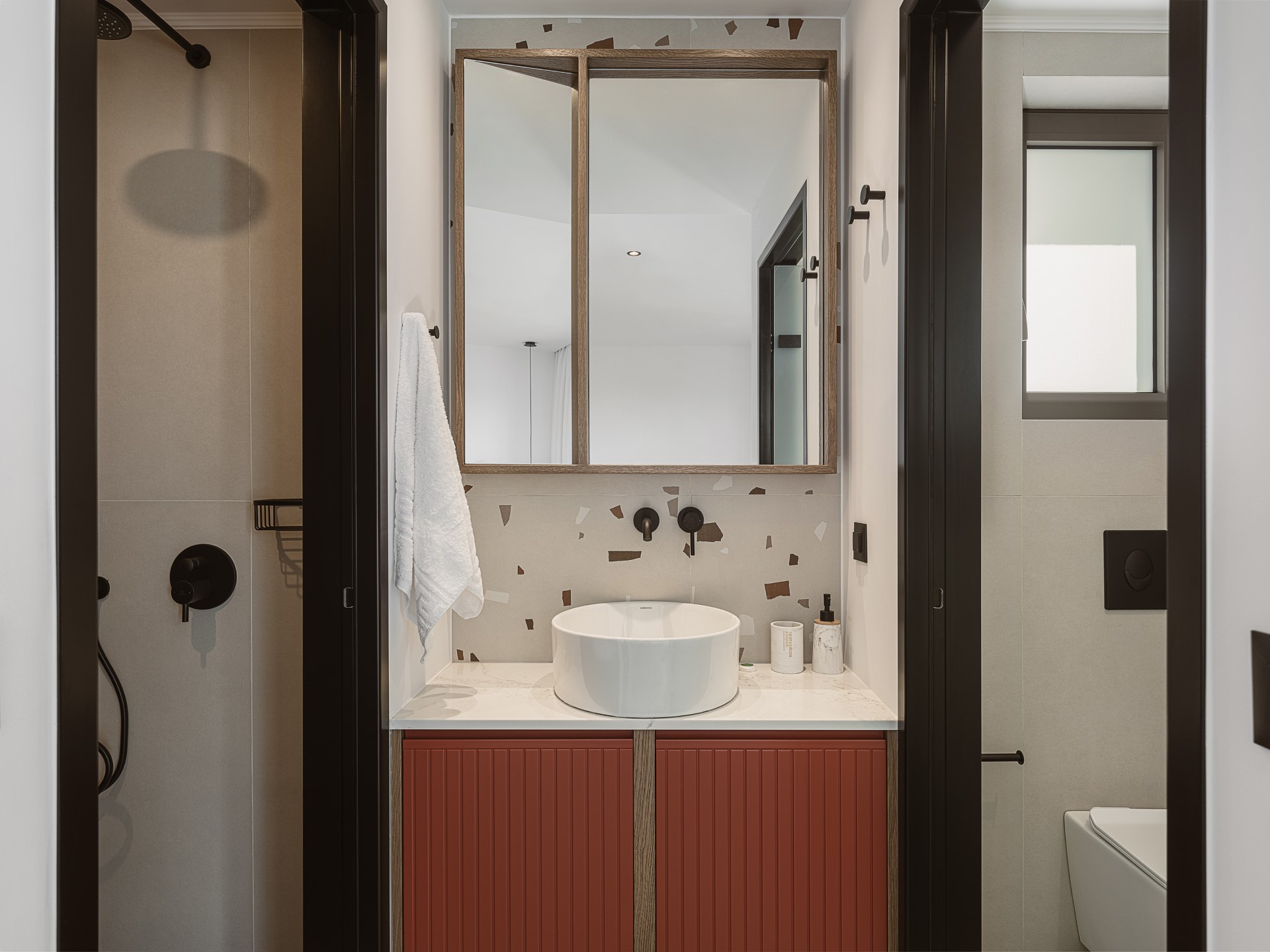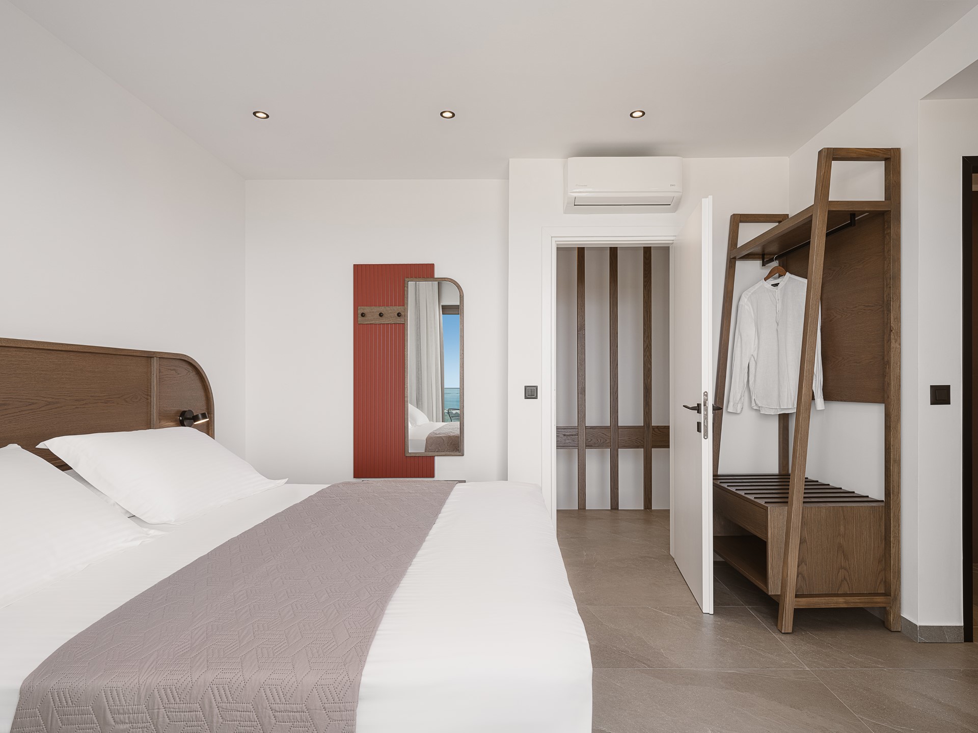 The villa features FIVE DOUBLE BEDROOMS, each designed as an INDEPENDENT SUITE. All bedrooms include EN-SUITE BATHROOMS WITH WALK-IN SHOWERS, air conditioning, wall-mounted TVs, open wardrobe areas, and dedicated desk or vanity spaces. Several bedrooms enjoy PRIVATE BALCONIES WITH SEA VIEWS, offering peaceful corners for quiet moments. An ADDITIONAL GUEST WC is available in the common areas, ensuring comfort and convenience during shared living.