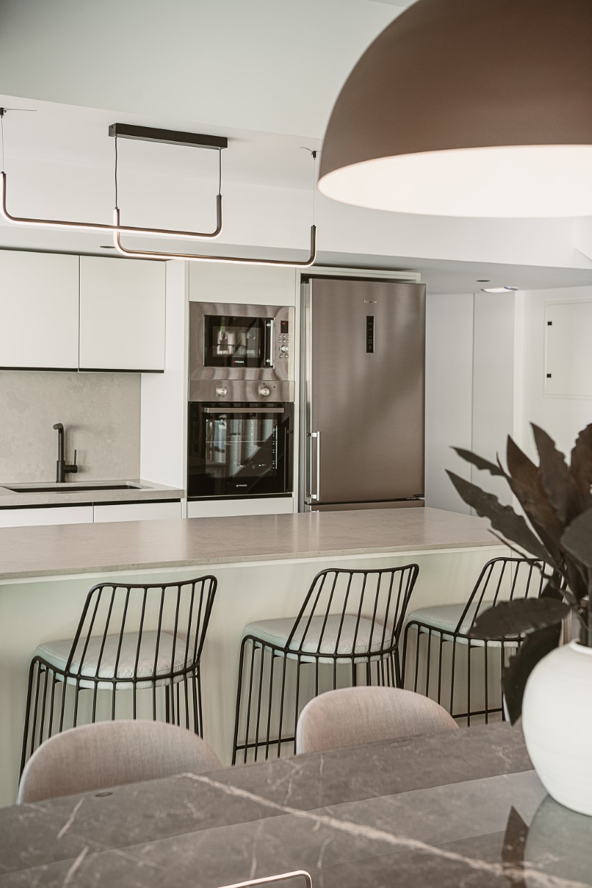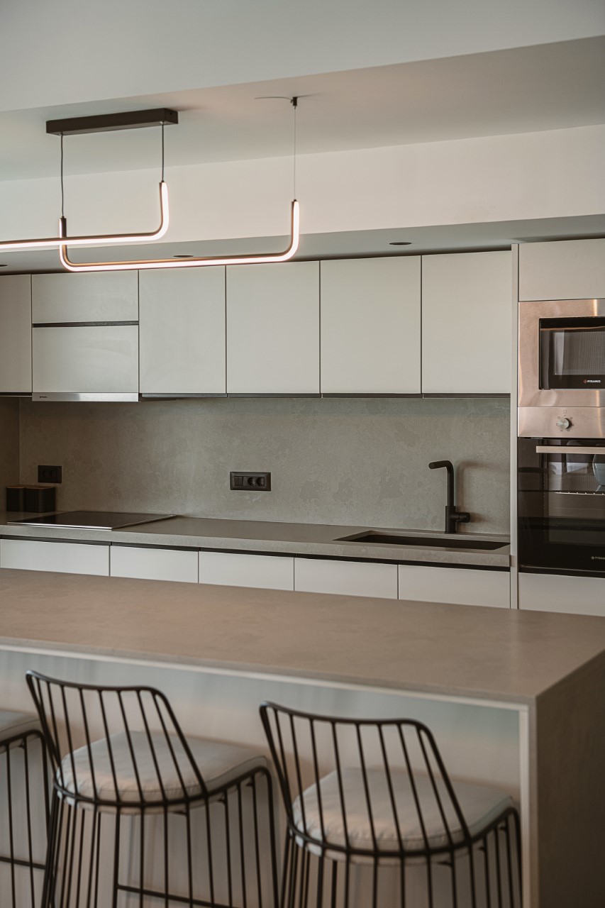 The living area offers a calm and comfortable setting for relaxation, complemented by a dining area ideal for shared meals. The kitchen is designed for both everyday use and social moments, featuring sleek cabinetry and high-quality appliances.
