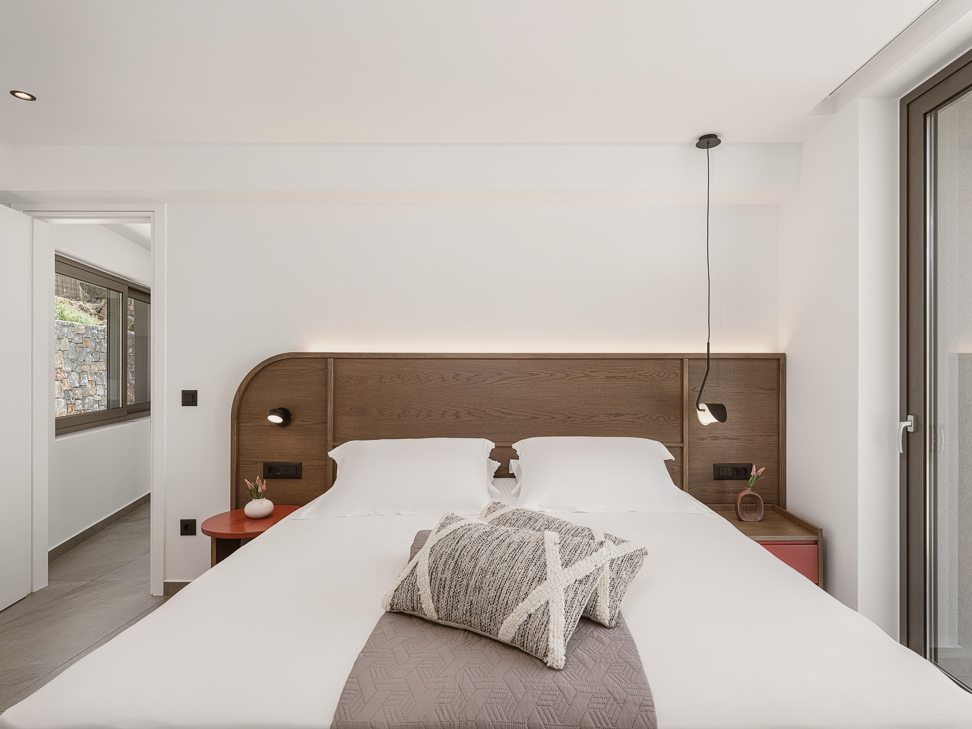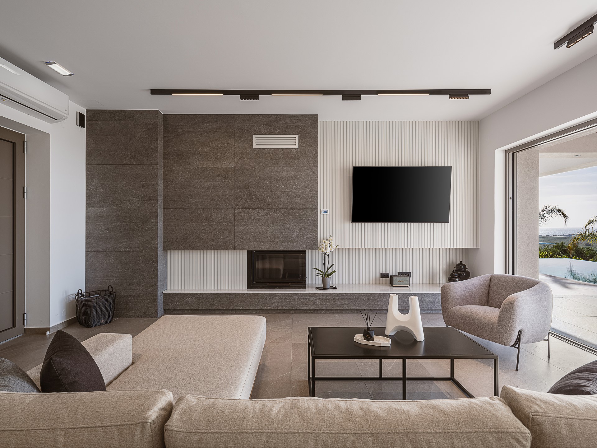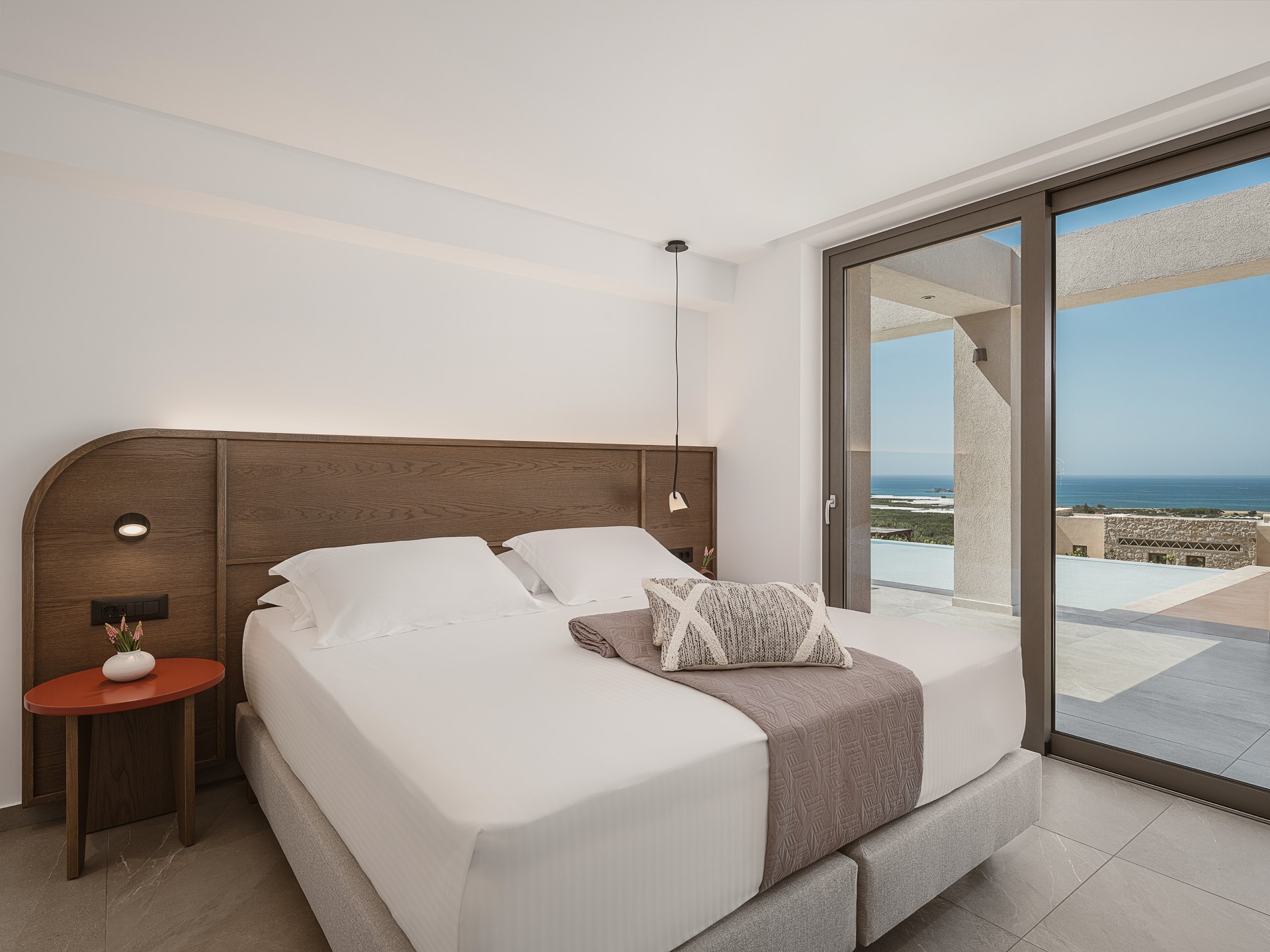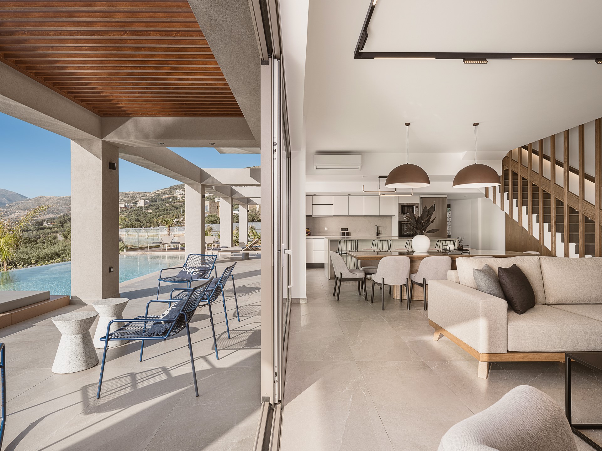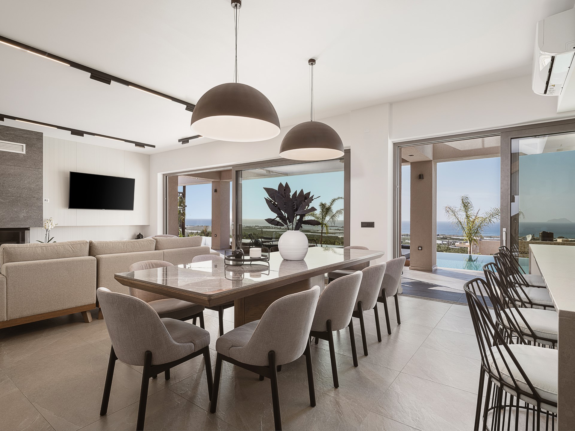 The interior of Architectural Seaview Villa is thoughtfully arranged to combine SPACIOUS SHARED LIVING AREAS with private retreat spaces. At the heart of the home is a BRIGHT OPEN-PLAN LIVING AREA that brings together the lounge, dining space, and a FULLY EQUIPPED MODERN KITCHEN. Neutral tones, bespoke wooden details, and carefully selected furnishings define the space, while FLOOR-TO-CEILING SLIDING GLASS DOORS connect the interior directly to the outdoor terraces, creating a fluid indoor-outdoor lifestyle.