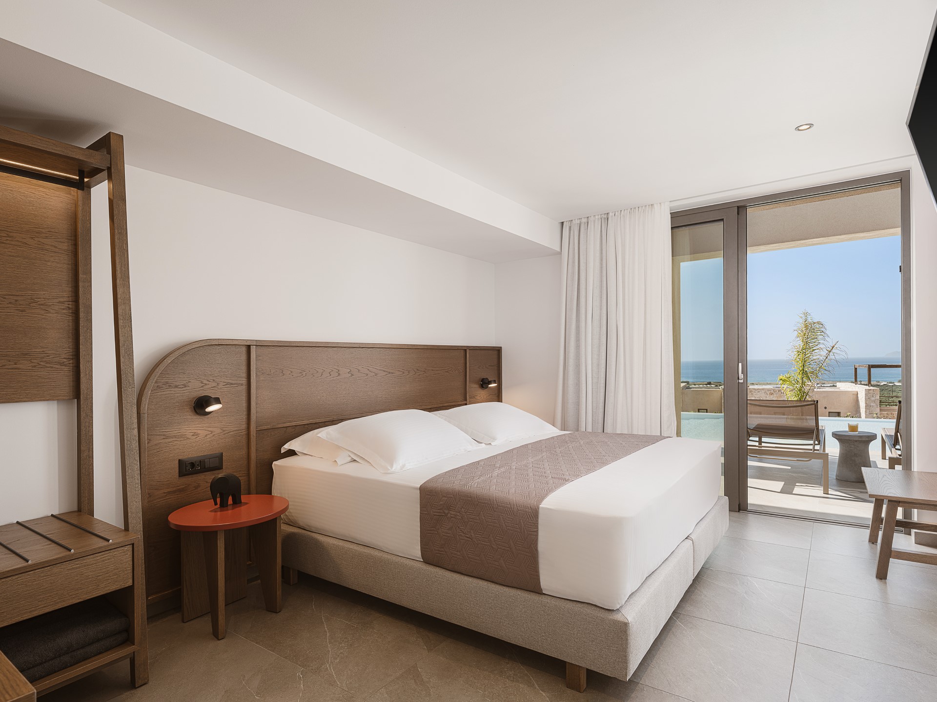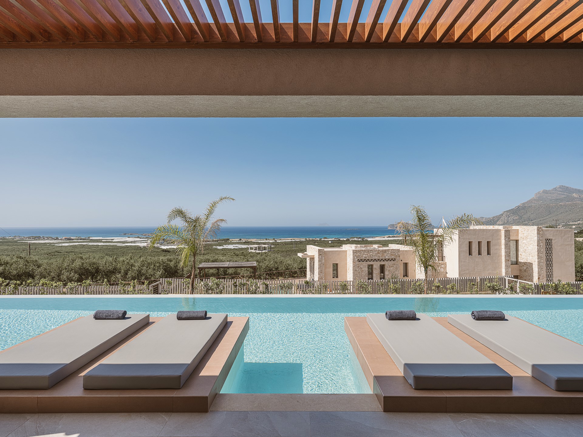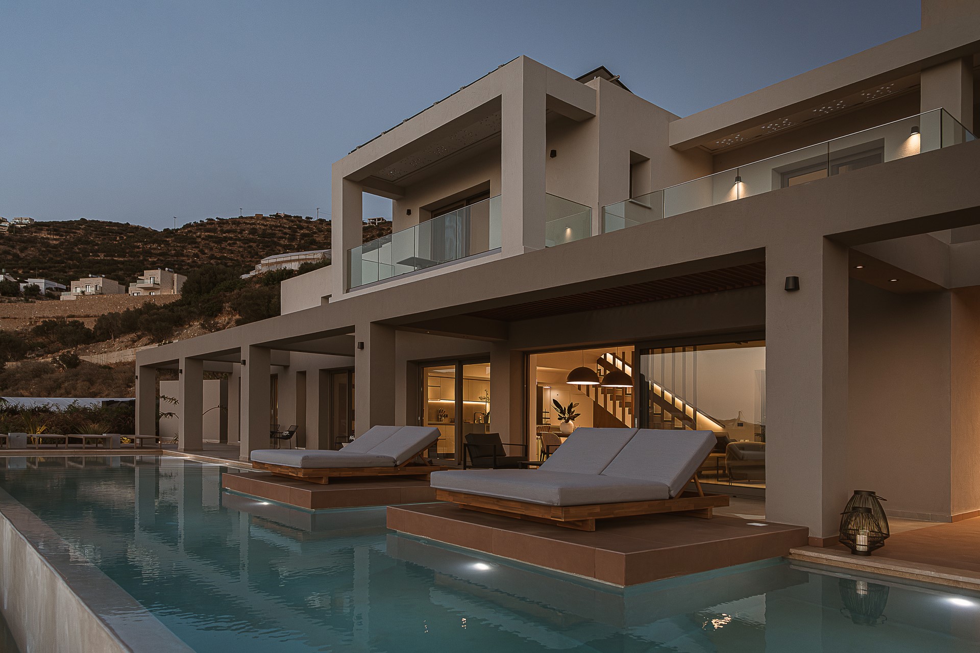 The outdoor spaces of Architectural Seaview Villa are a defining element of the experience, designed as a natural extension of the interior living areas and oriented toward UNINTERRUPTED SEA VIEWS. By day, natural light highlights the villa’s clean architectural lines, earthy textures, and the seamless balance between shaded and open spaces. The INFINITY POOL stretches toward the horizon, visually blending with the sea, while sun loungers positioned directly above the water invite long, leisurely afternoons under the CRETAN SUN.