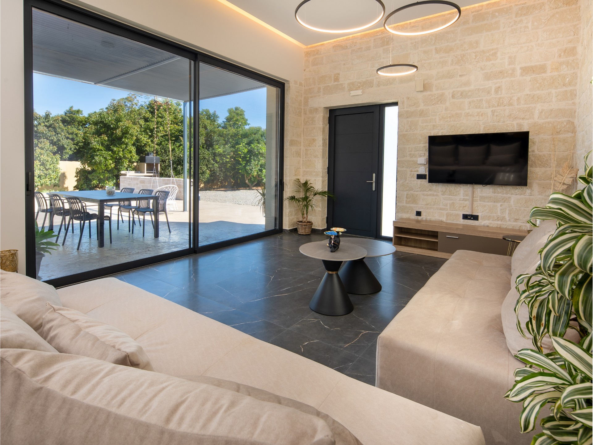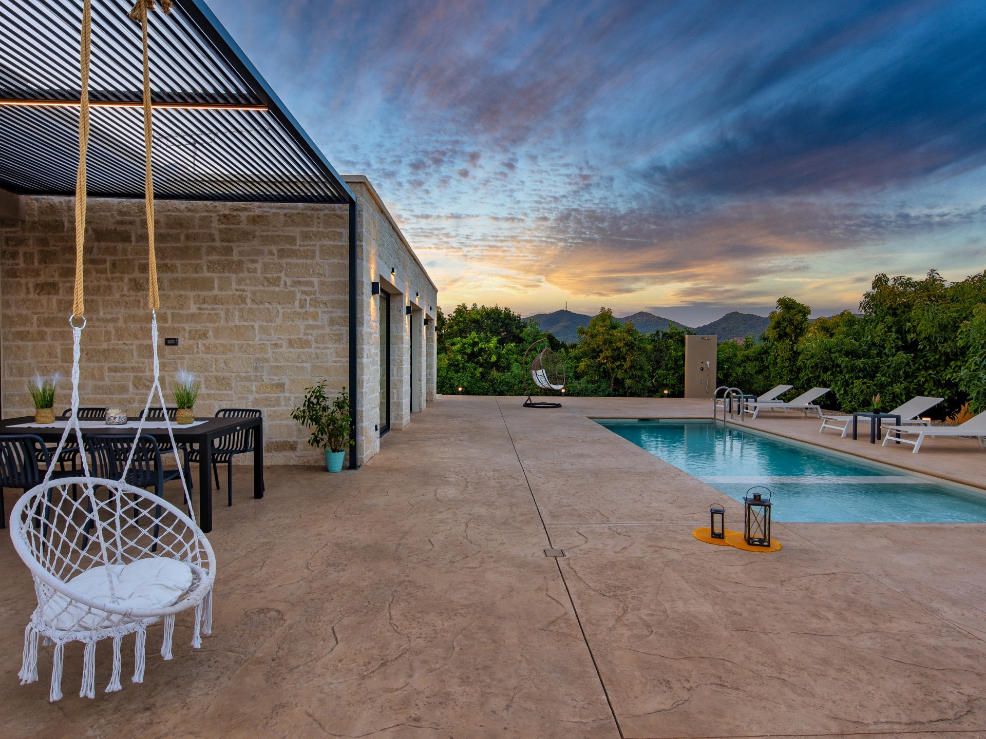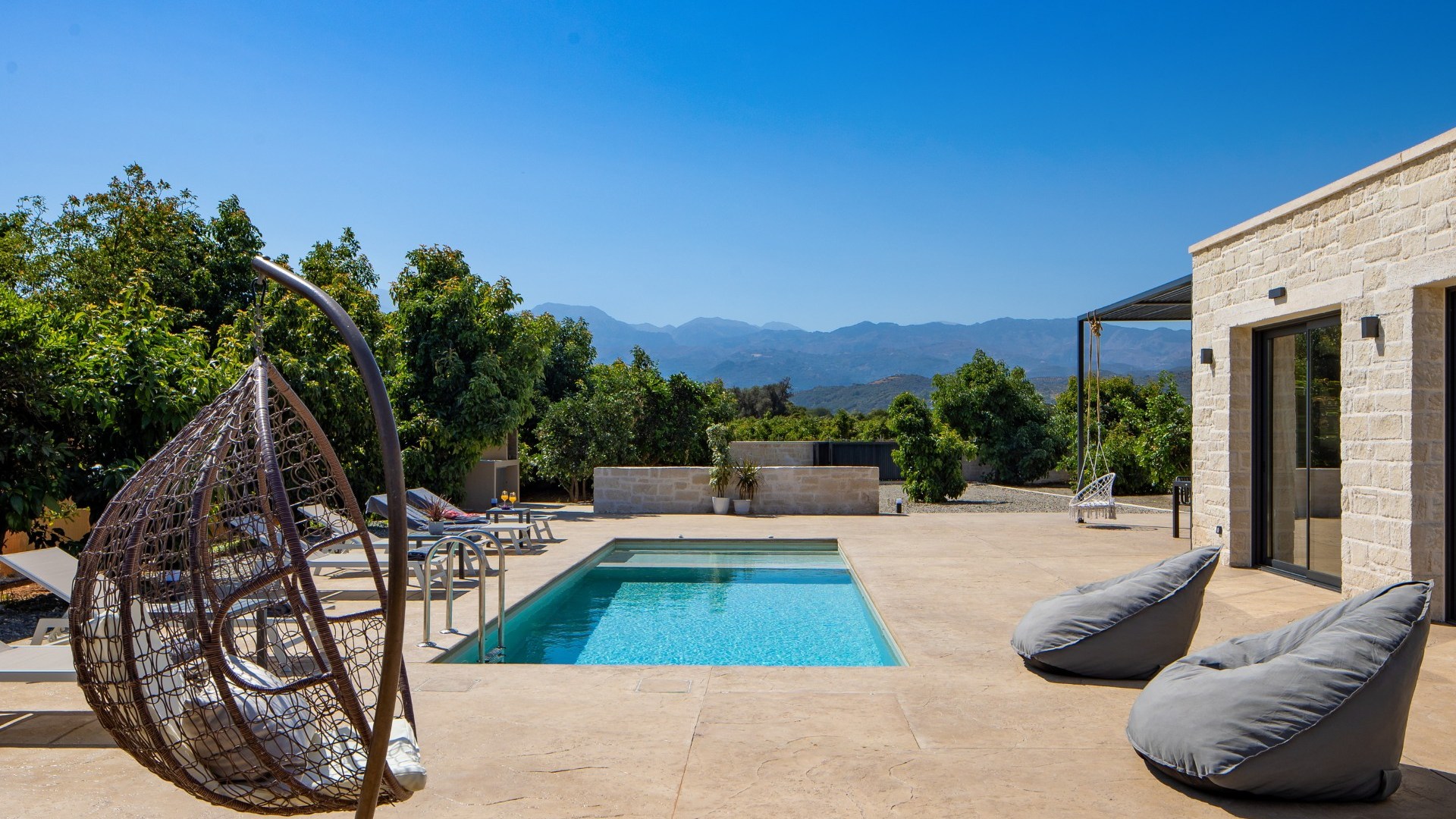 Discover the Aurora luxury villa surrounded by citrus groves and mountain views in the Cretan countryside. designed for comfort and style, it features three elegant bedrooms, spa-inspired bathrooms, a modern kitchen, and bright living spaces with direct access to the pool. outside, relax by your private swimming pool, enjoy the BBQ and shaded dining area, and experience the perfect blend of tranquility and modern luxury just a short drive from Chania city.