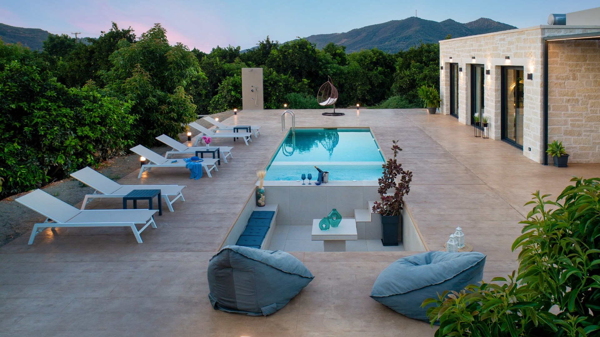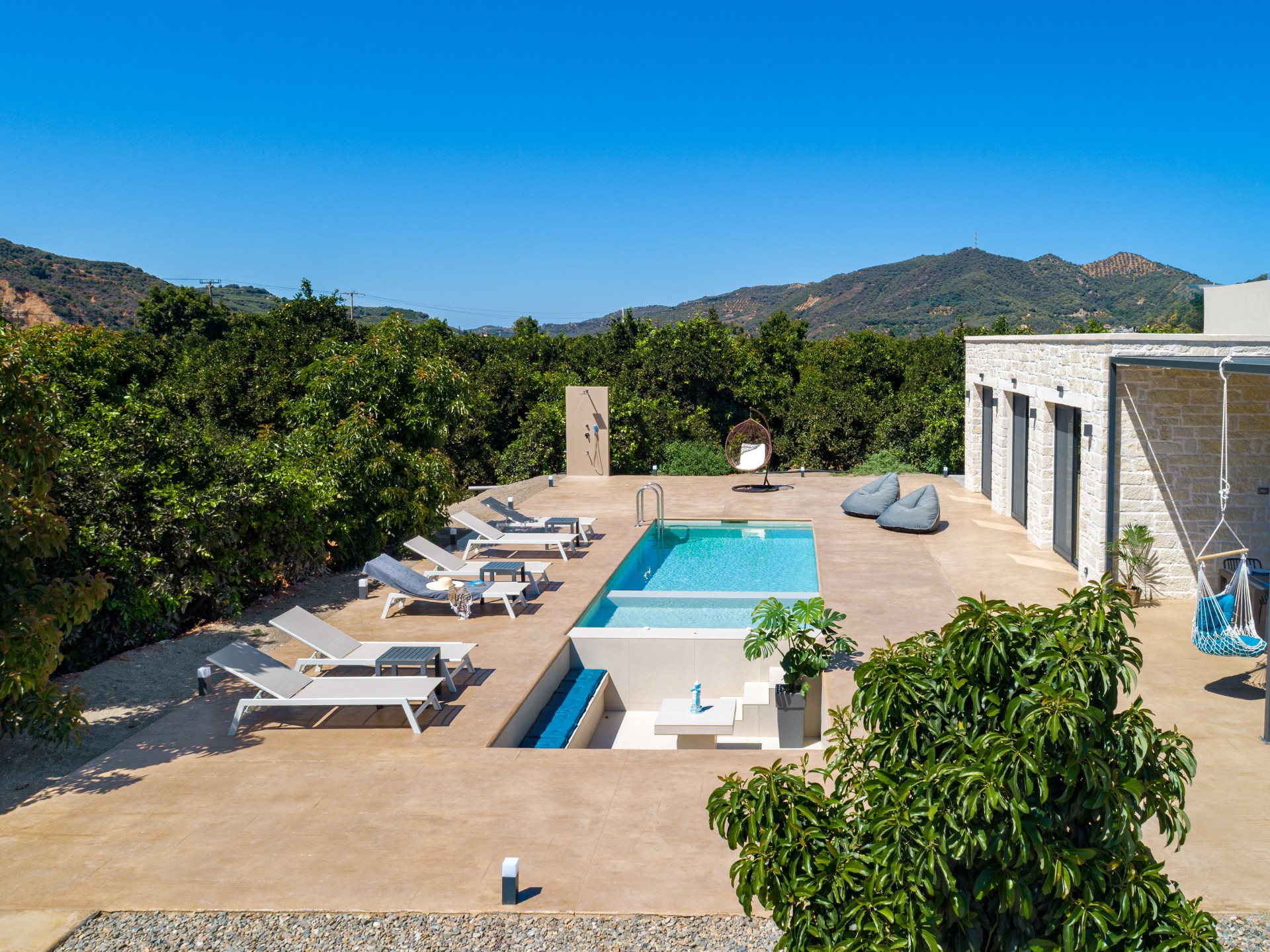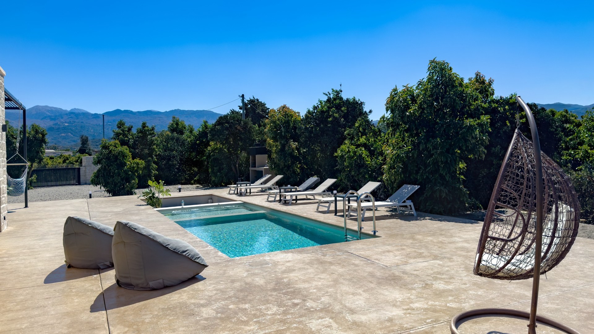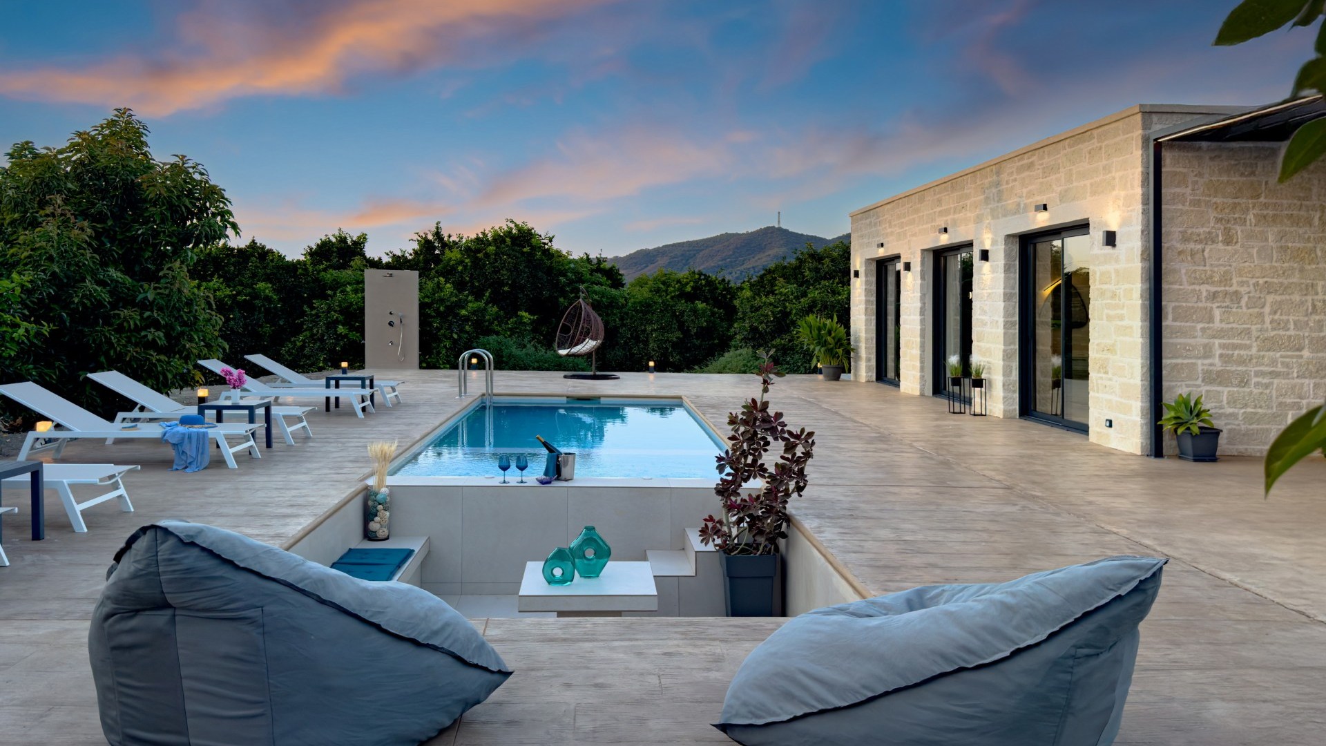 Escape to a modern retreat set in the tranquil village of Agia, surrounded by lush groves and mountain scenery. This elegant villa offers three stylish bedrooms, marble-topped bathrooms, a fully equipped kitchen, and open living areas bathed in natural light. Step outside to your private pool with a jacuzzi section, unwind in the elegant built-in lounge by the water, a perfect spot for morning coffee or evening cocktails, relax under the pergola, just 15 minutes from Chania’s vibrant old town.