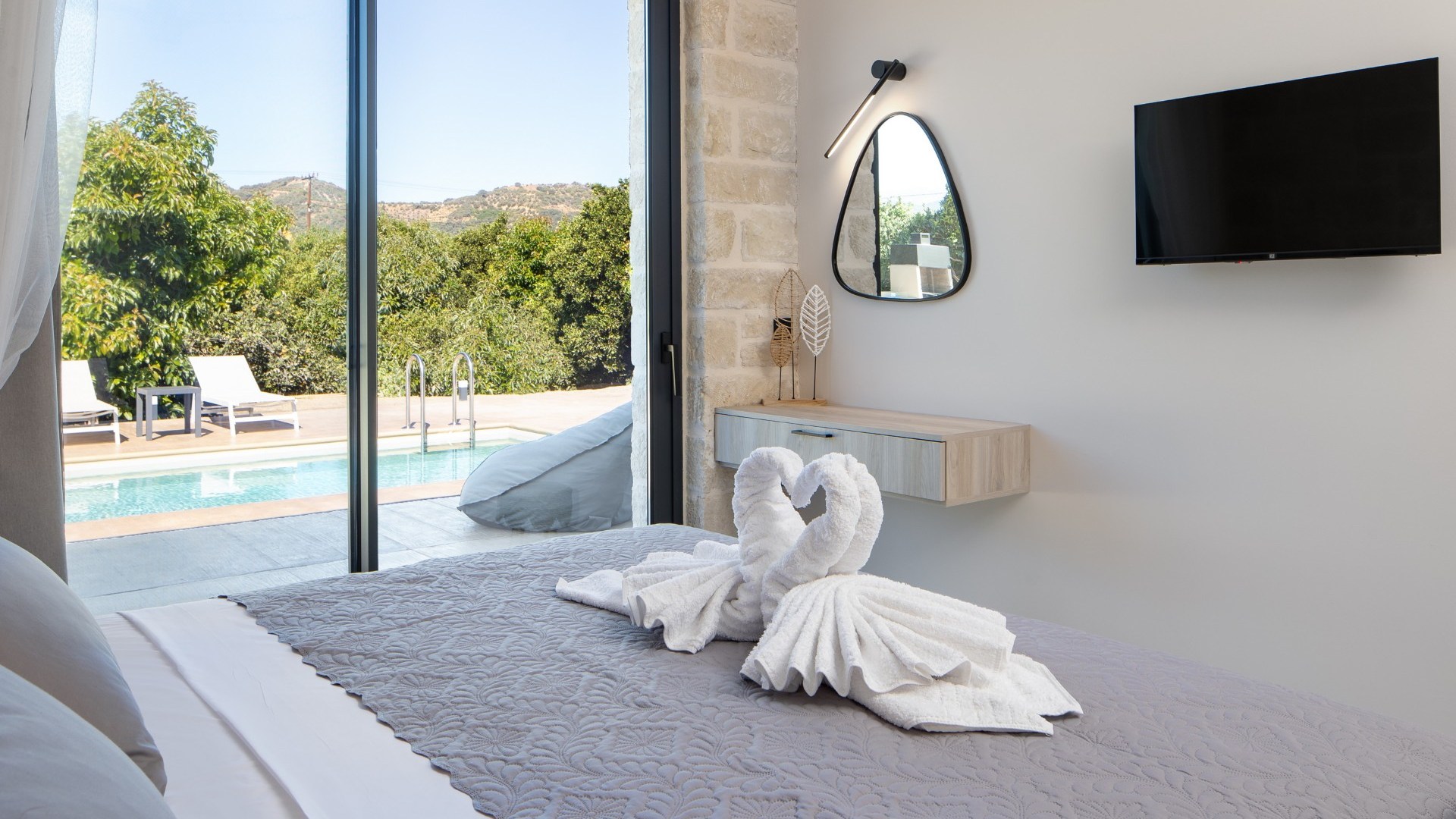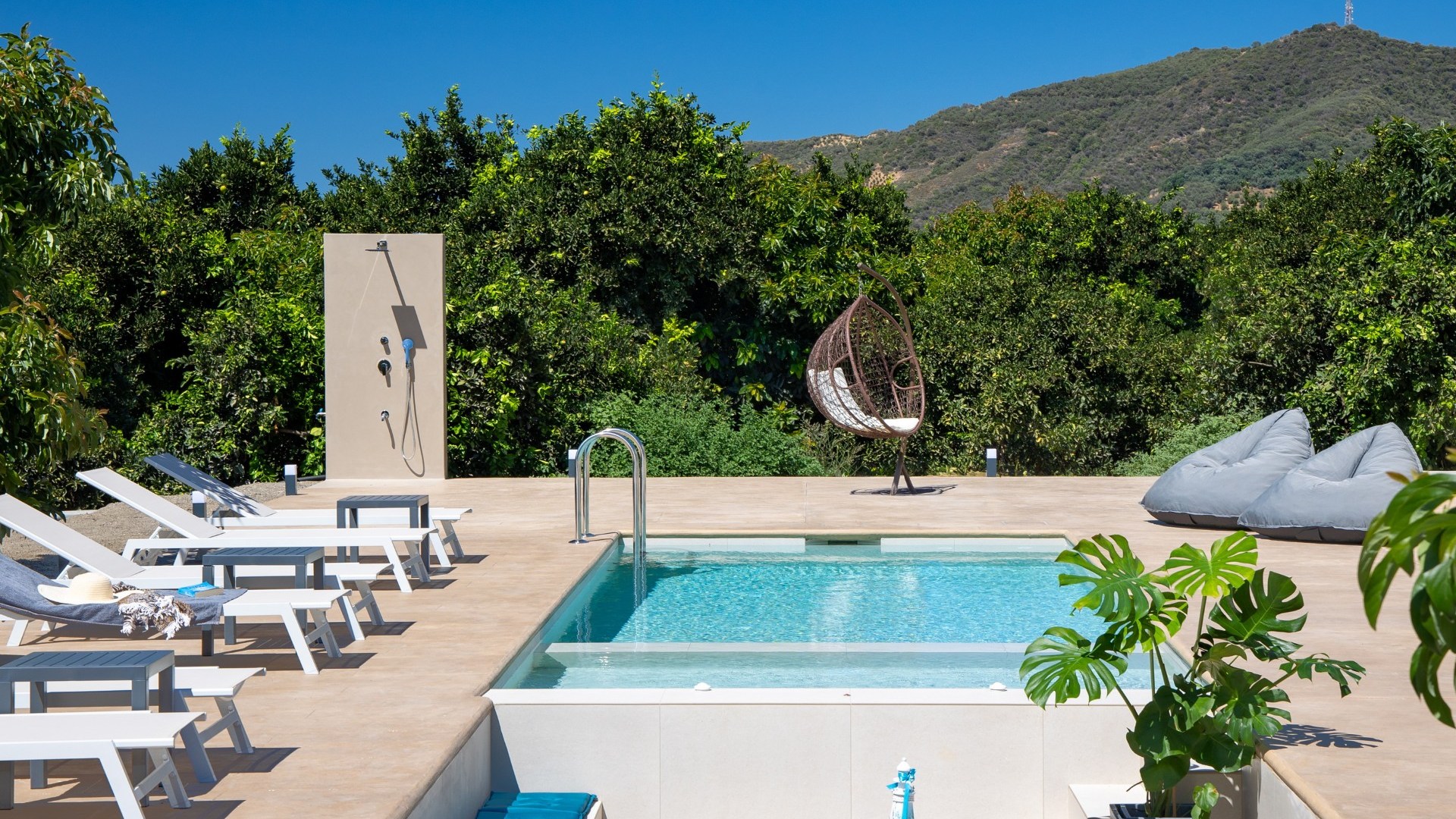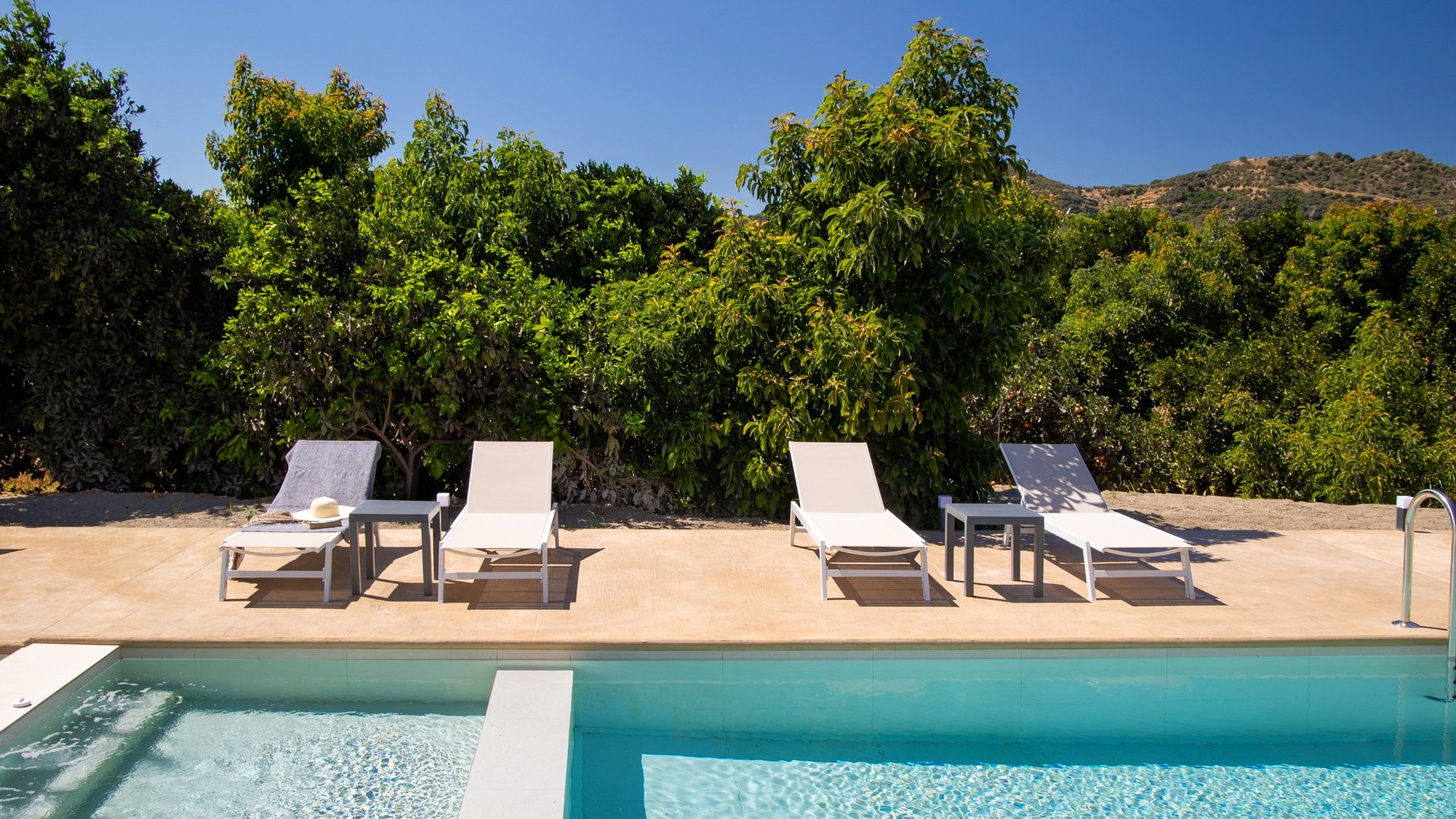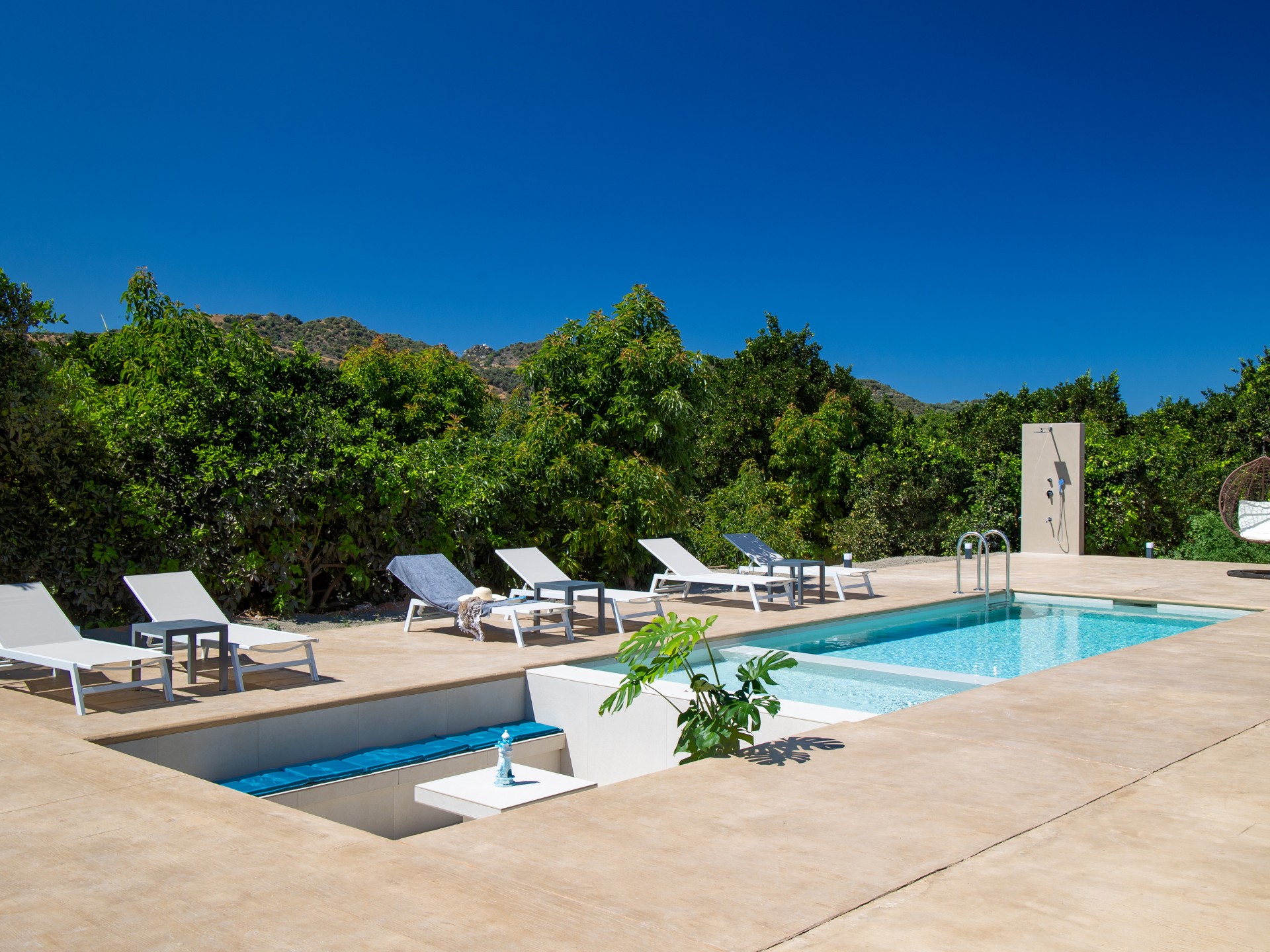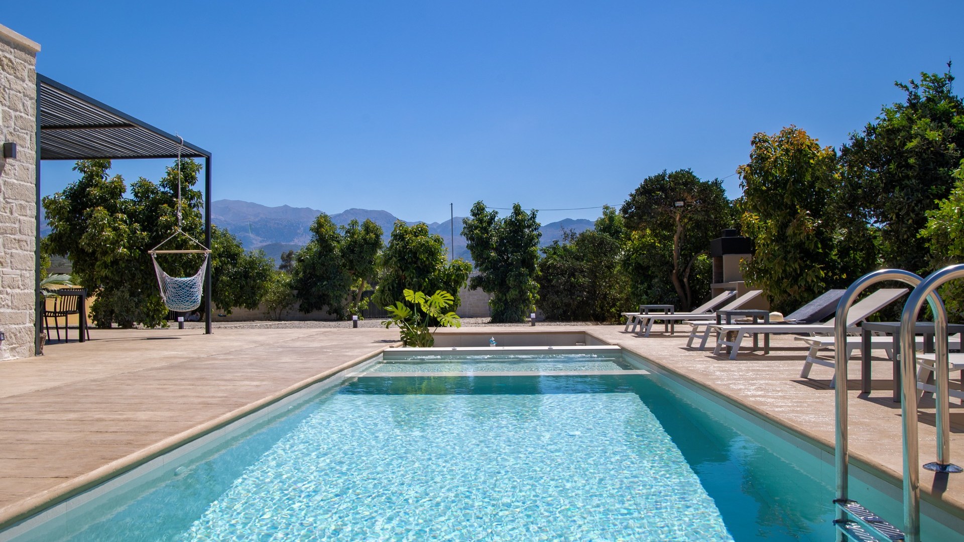 Escape to a modern retreat set in the tranquil village of Agia, surrounded by lush groves and mountain scenery. This elegant villa offers three stylish bedrooms, marble-topped bathrooms, a fully equipped kitchen, and open living areas bathed in natural light. Step outside to your private pool with a jacuzzi section, unwind in the elegant built-in lounge by the water, a perfect spot for morning coffee or evening cocktails, relax under the pergola, just 15 minutes from Chania’s vibrant old town.