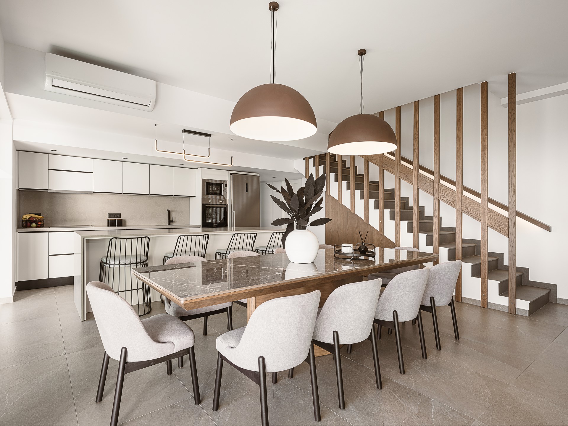 The living area offers a calm and comfortable setting for relaxation, complemented by a dining area ideal for shared meals. The kitchen is designed for both everyday use and social moments, featuring sleek cabinetry and high-quality appliances.