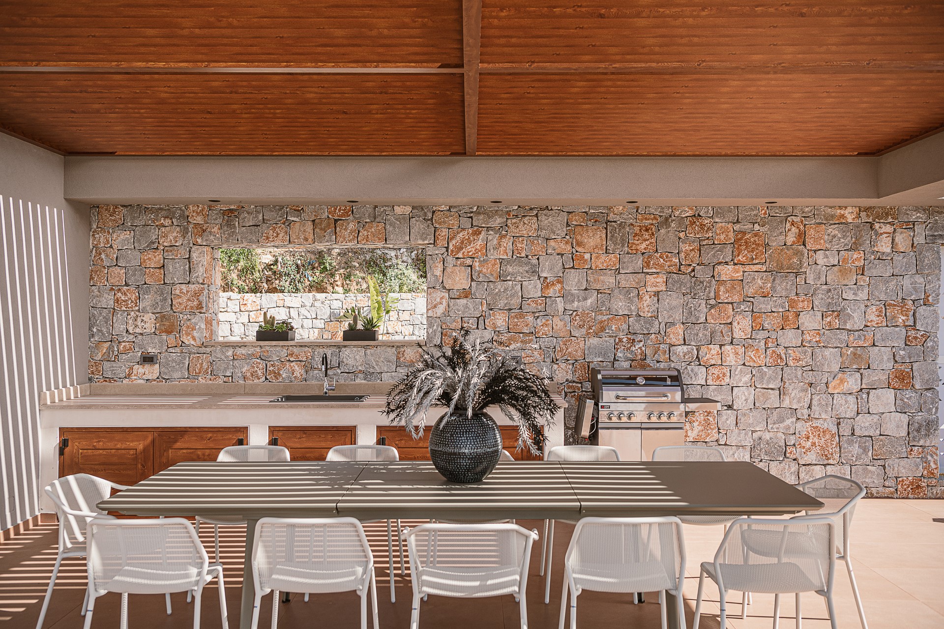 Shaded pergolas with wooden slats frame generous lounge areas and a spacious outdoor dining setting. A FULLY EQUIPPED OUTDOOR KITCHEN AND BARBECUE AREA make alfresco dining effortless, whether for relaxed lunches or long evenings with family and friends. Natural stone elements and neutral tones blend harmoniously with the surrounding olive groves and open coastline, offering a RARE SENSE OF PRIVACY while maintaining openness and uninterrupted views.