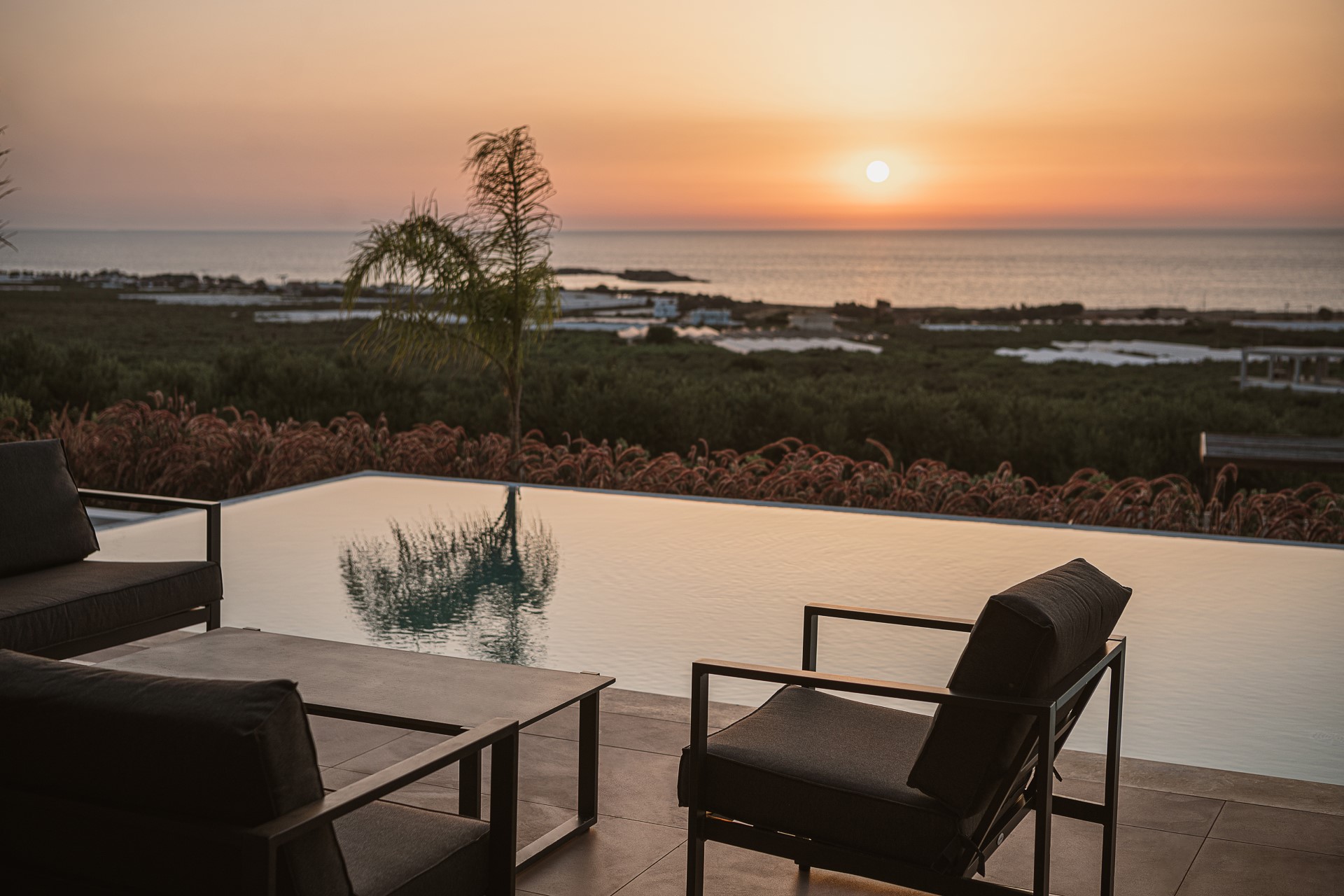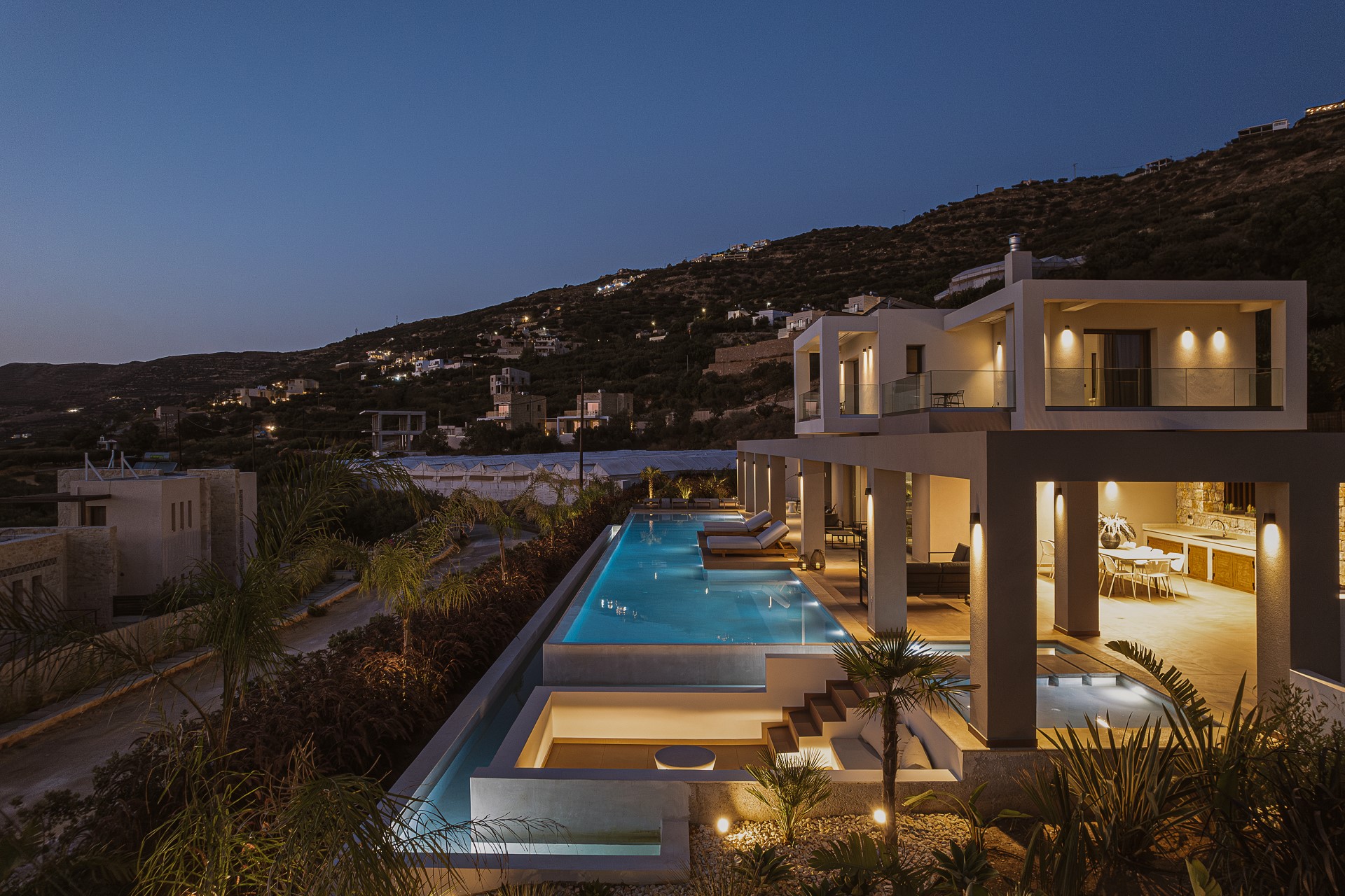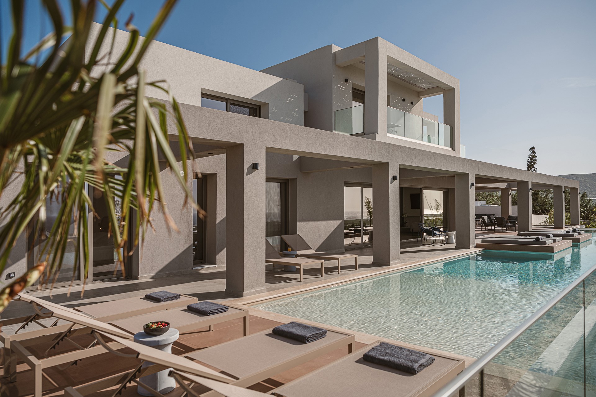 The outdoor spaces of Architectural Seaview Villa are a defining element of the experience, designed as a natural extension of the interior living areas and oriented toward UNINTERRUPTED SEA VIEWS. By day, natural light highlights the villa’s clean architectural lines, earthy textures, and the seamless balance between shaded and open spaces. The INFINITY POOL stretches toward the horizon, visually blending with the sea, while sun loungers positioned directly above the water invite long, leisurely afternoons under the CRETAN SUN.