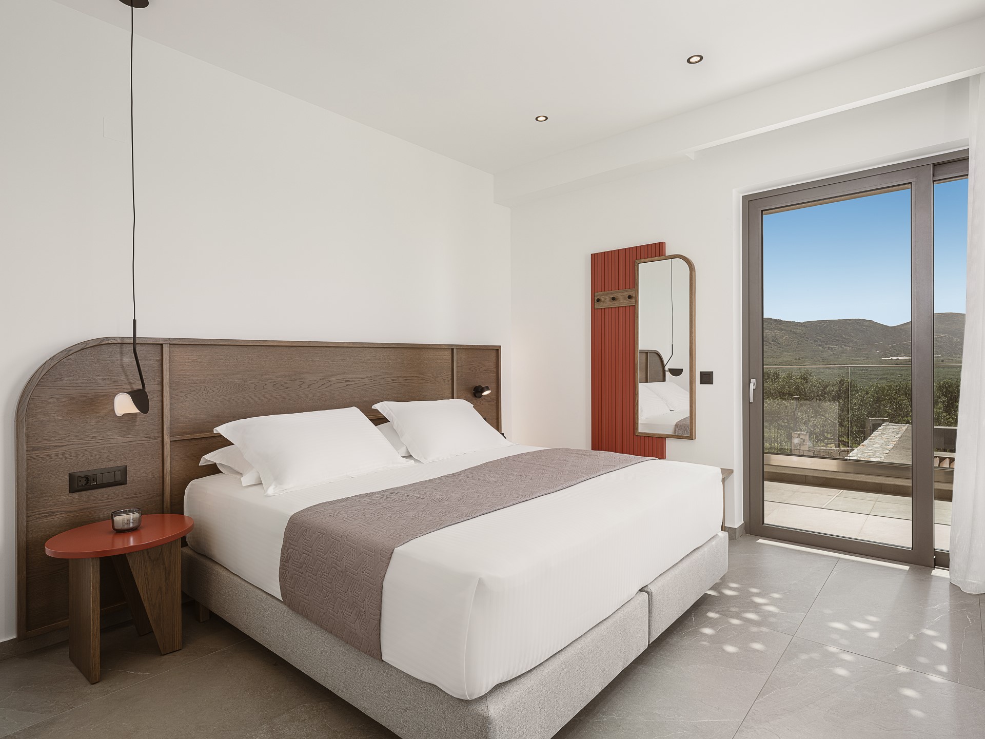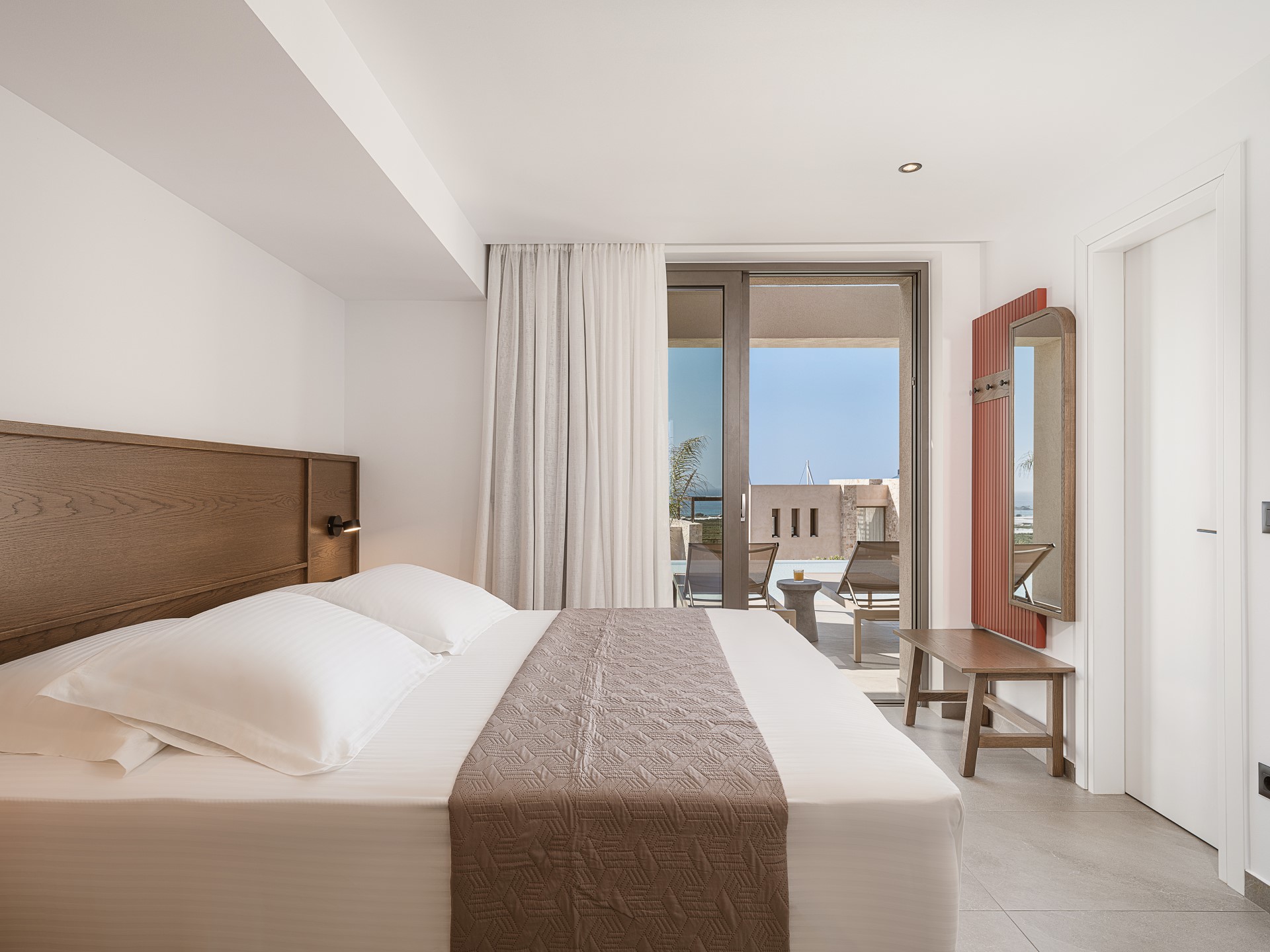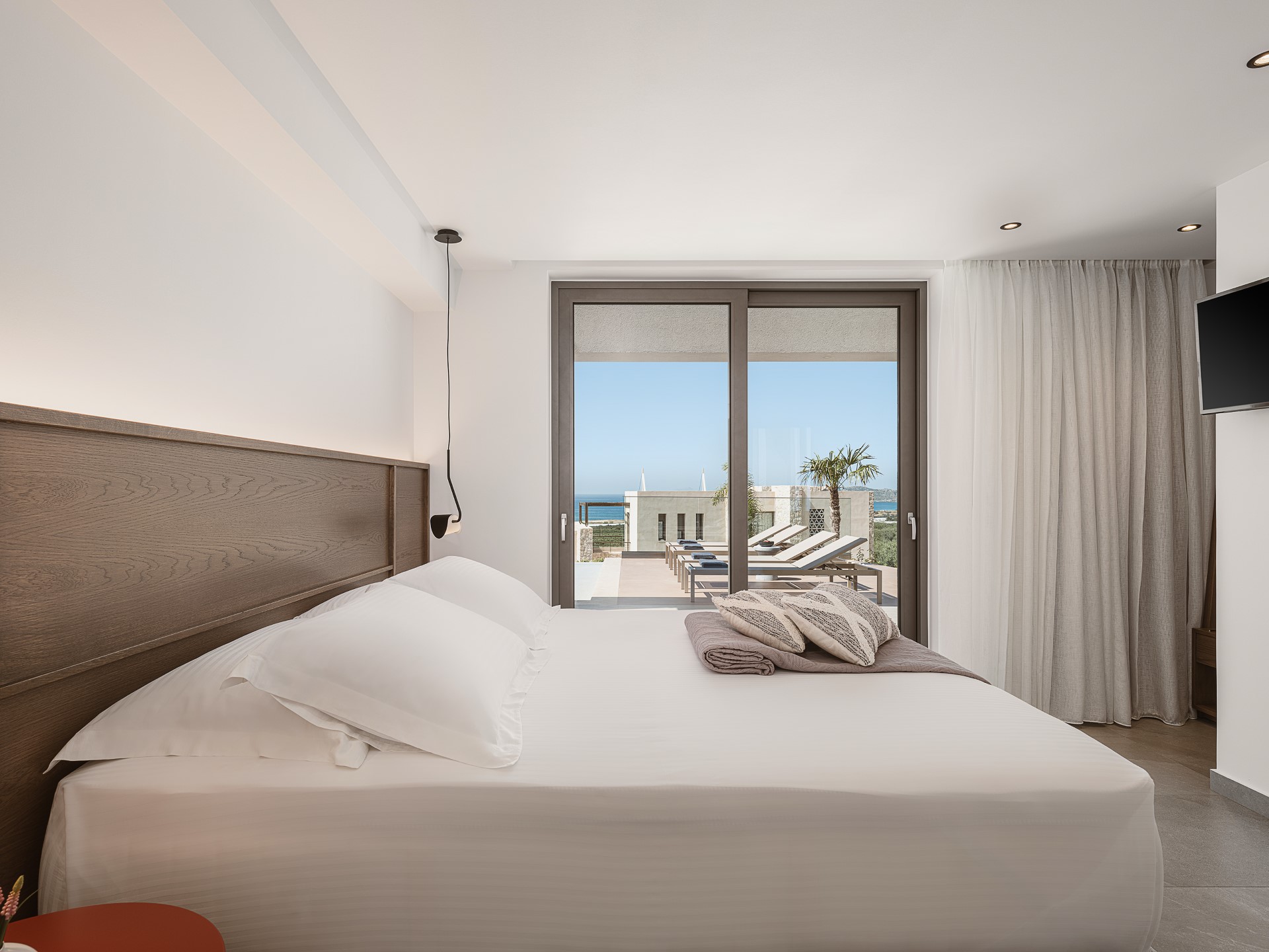 The outdoor spaces of Architectural Seaview Villa are a defining element of the experience, designed as a natural extension of the interior living areas and oriented toward UNINTERRUPTED SEA VIEWS. By day, natural light highlights the villa’s clean architectural lines, earthy textures, and the seamless balance between shaded and open spaces. The INFINITY POOL stretches toward the horizon, visually blending with the sea, while sun loungers positioned directly above the water invite long, leisurely afternoons under the CRETAN SUN.