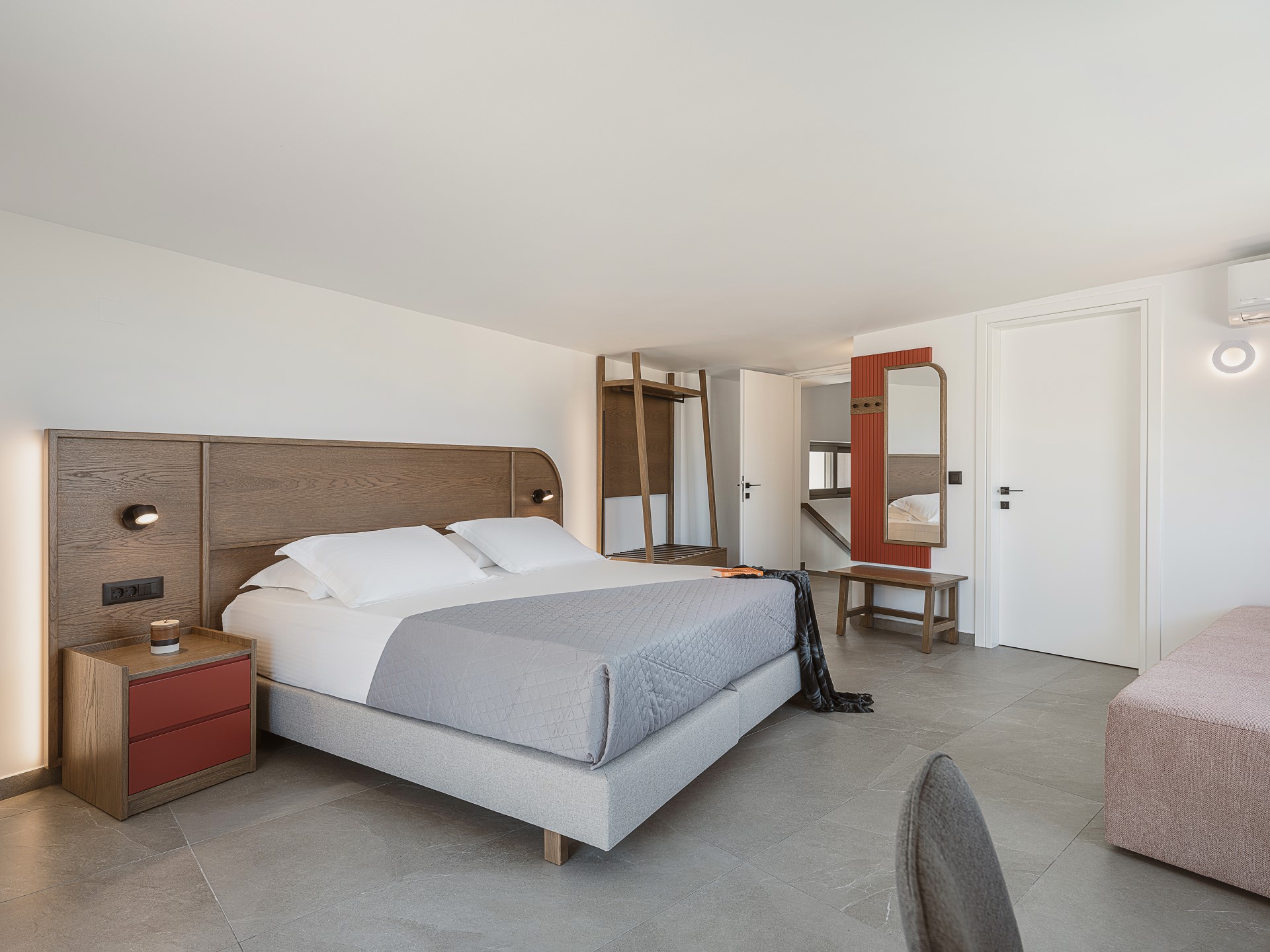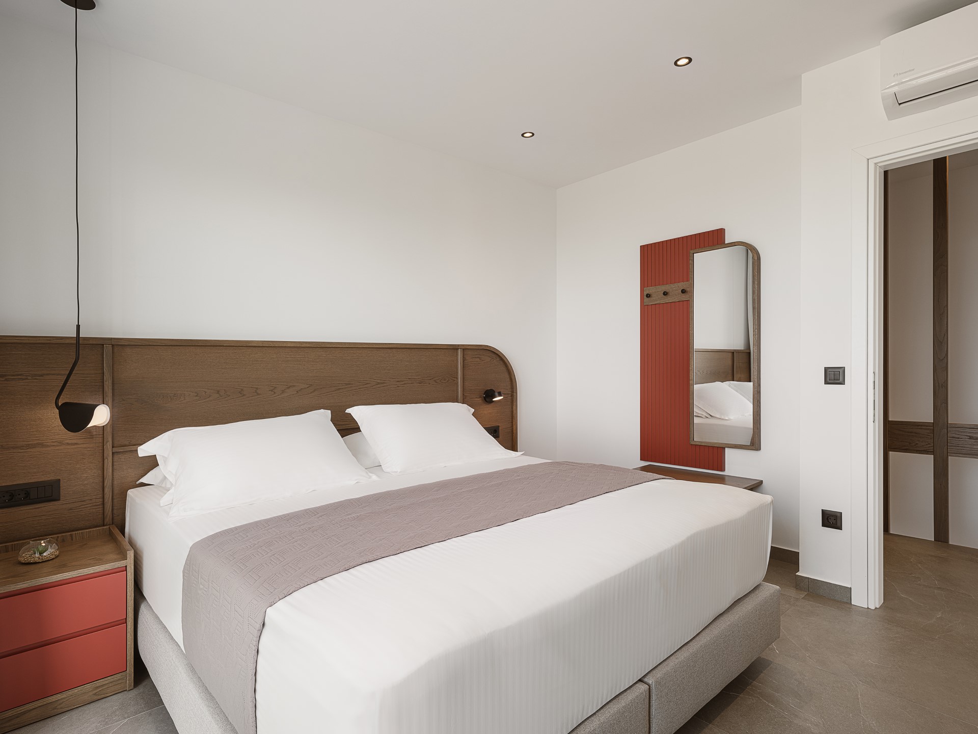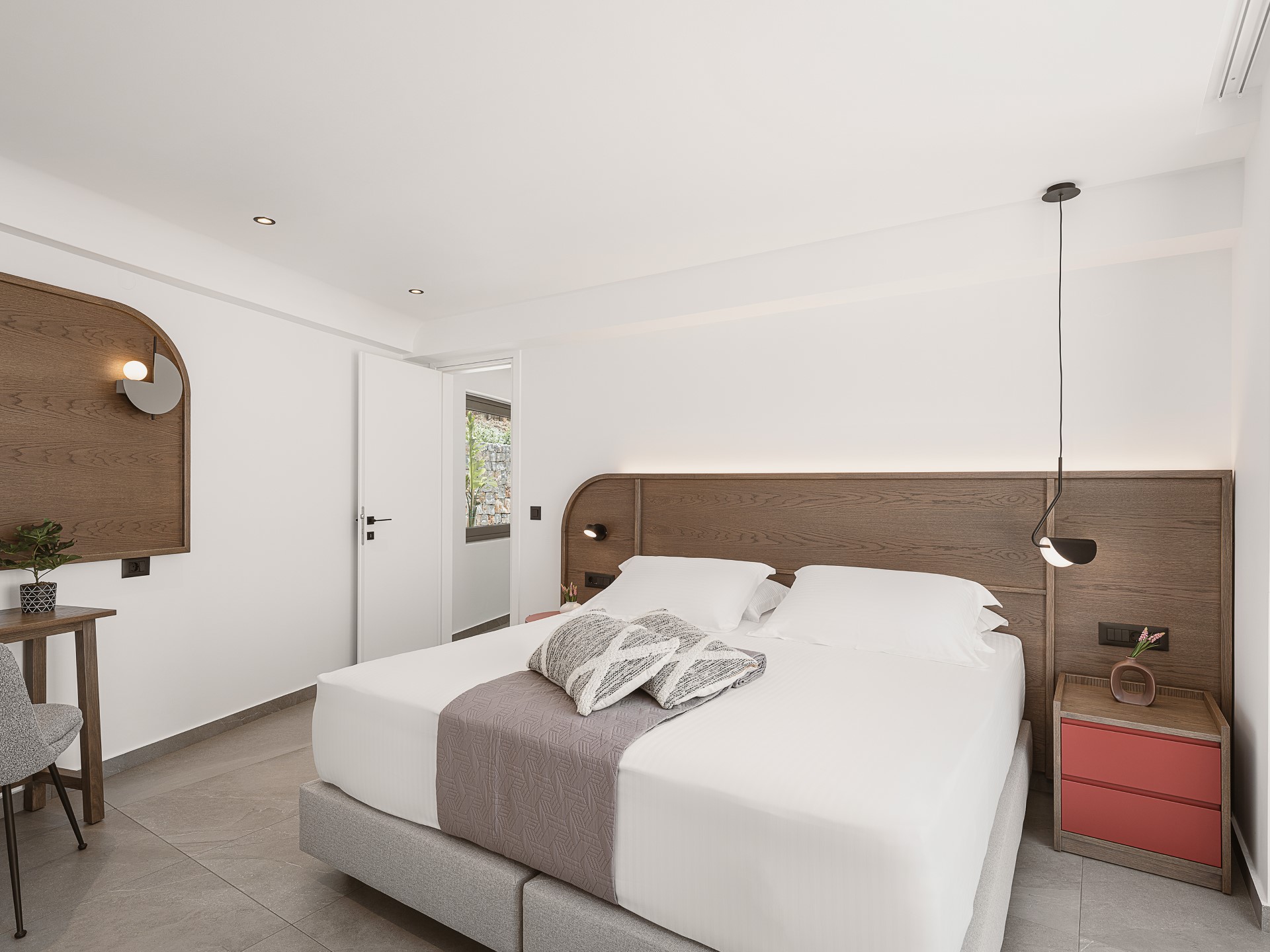 The villa features FIVE DOUBLE BEDROOMS, each designed as an INDEPENDENT SUITE. All bedrooms include EN-SUITE BATHROOMS WITH WALK-IN SHOWERS, air conditioning, wall-mounted TVs, open wardrobe areas, and dedicated desk or vanity spaces. Several bedrooms enjoy PRIVATE BALCONIES WITH SEA VIEWS, offering peaceful corners for quiet moments. An ADDITIONAL GUEST WC is available in the common areas, ensuring comfort and convenience during shared living.