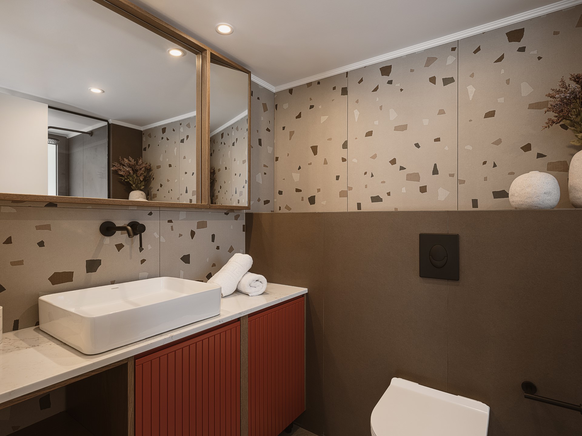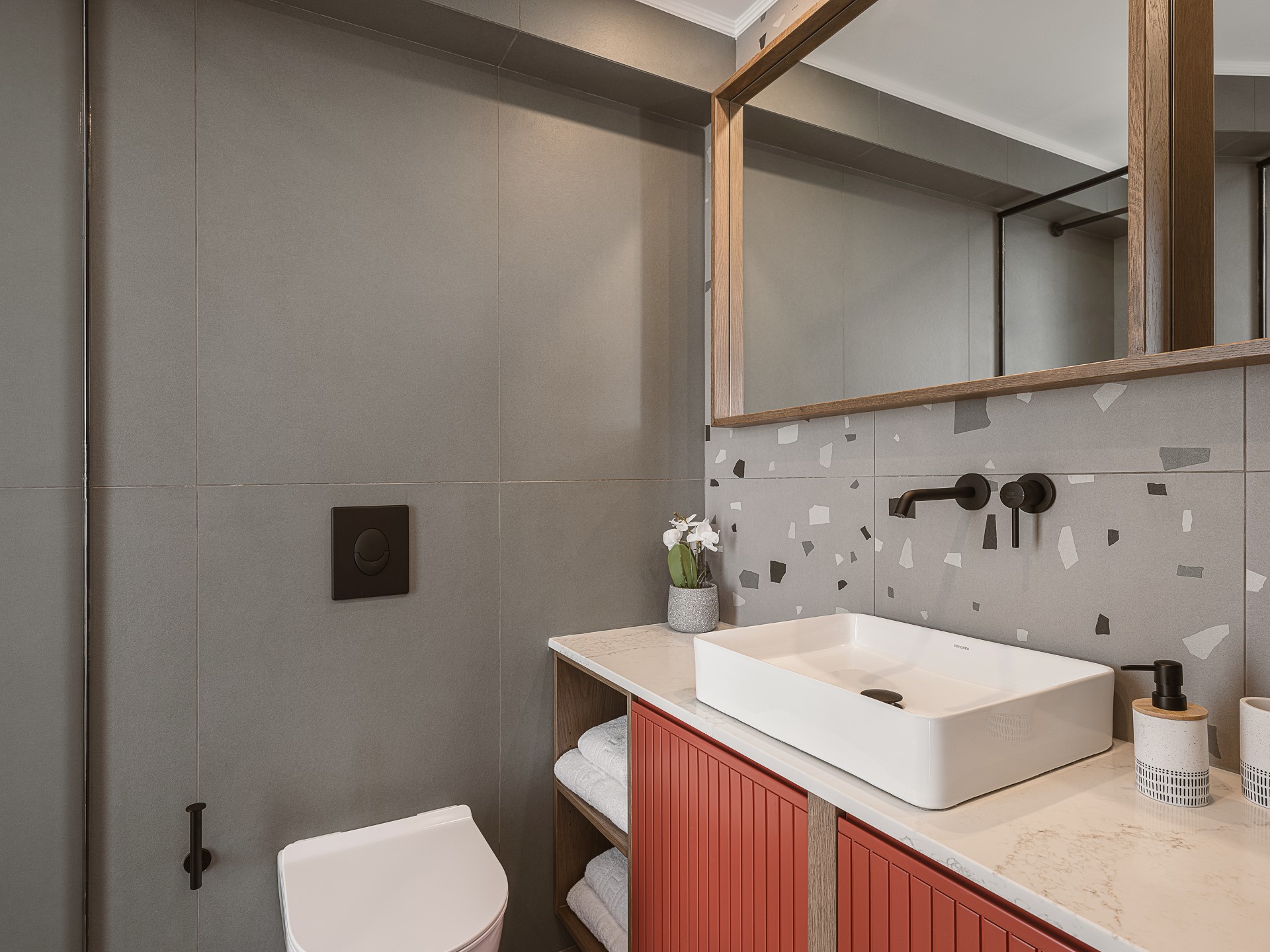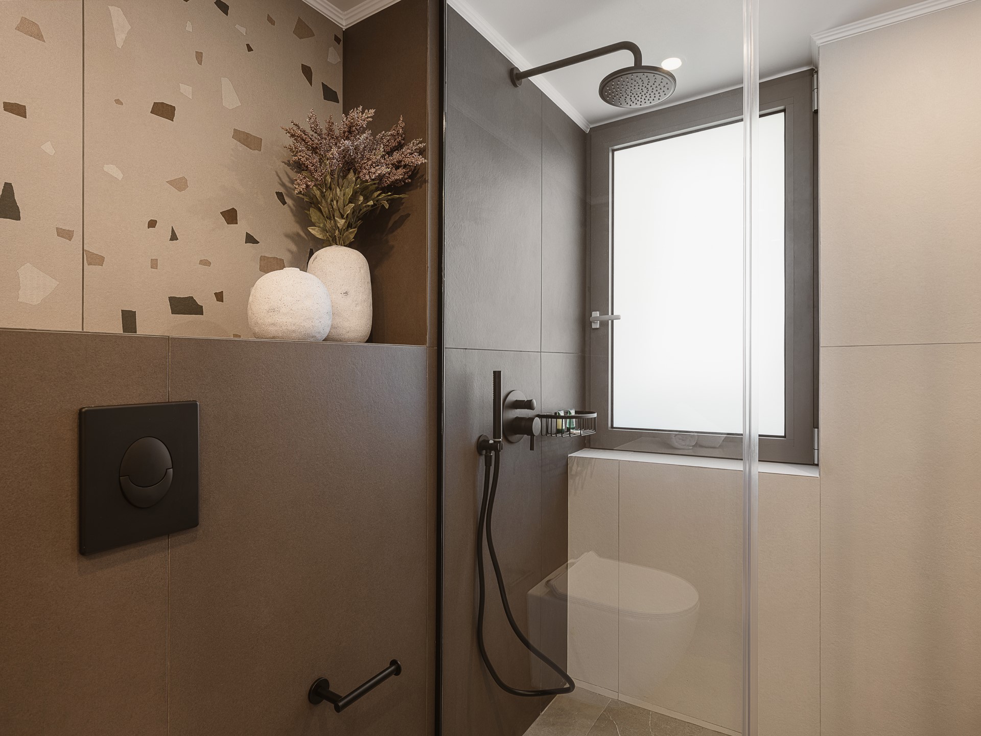 The villa features FIVE DOUBLE BEDROOMS, each designed as an INDEPENDENT SUITE. All bedrooms include EN-SUITE BATHROOMS WITH WALK-IN SHOWERS, air conditioning, wall-mounted TVs, open wardrobe areas, and dedicated desk or vanity spaces. Several bedrooms enjoy PRIVATE BALCONIES WITH SEA VIEWS, offering peaceful corners for quiet moments. An ADDITIONAL GUEST WC is available in the common areas, ensuring comfort and convenience during shared living.