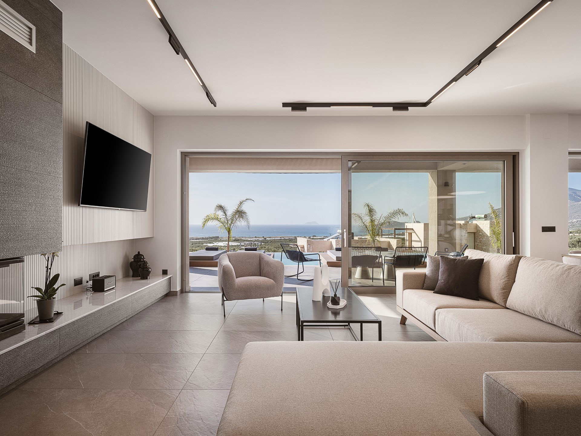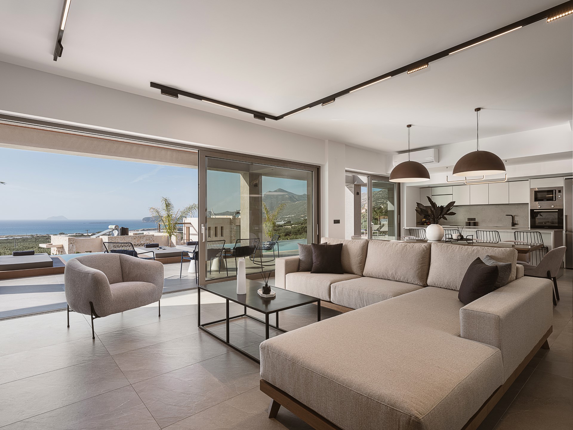 The interior of Architectural Seaview Villa is thoughtfully arranged to combine SPACIOUS SHARED LIVING AREAS with private retreat spaces. At the heart of the home is a BRIGHT OPEN-PLAN LIVING AREA that brings together the lounge, dining space, and a FULLY EQUIPPED MODERN KITCHEN. Neutral tones, bespoke wooden details, and carefully selected furnishings define the space, while FLOOR-TO-CEILING SLIDING GLASS DOORS connect the interior directly to the outdoor terraces, creating a fluid indoor-outdoor lifestyle.