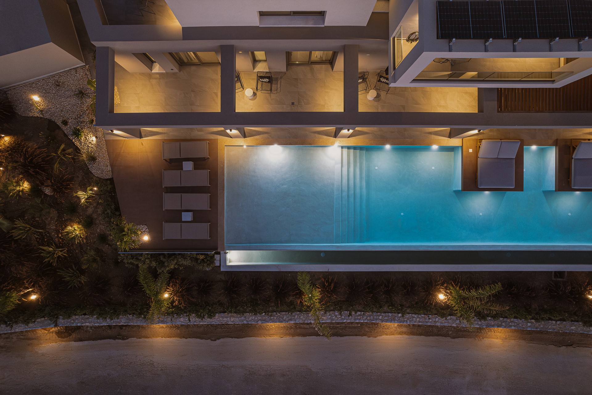 As the sun sets, the villa reveals its most captivating character. Warm evening light reflects gently across the infinity pool and the sea beyond, while subtle outdoor lighting enhances the architectural lines and creates a calm, inviting atmosphere. Evenings are defined by GLOWING SUNSETS, quiet conversations, and slow dinners by the pool, offering an ideal setting for relaxation, connection, and complete escape.