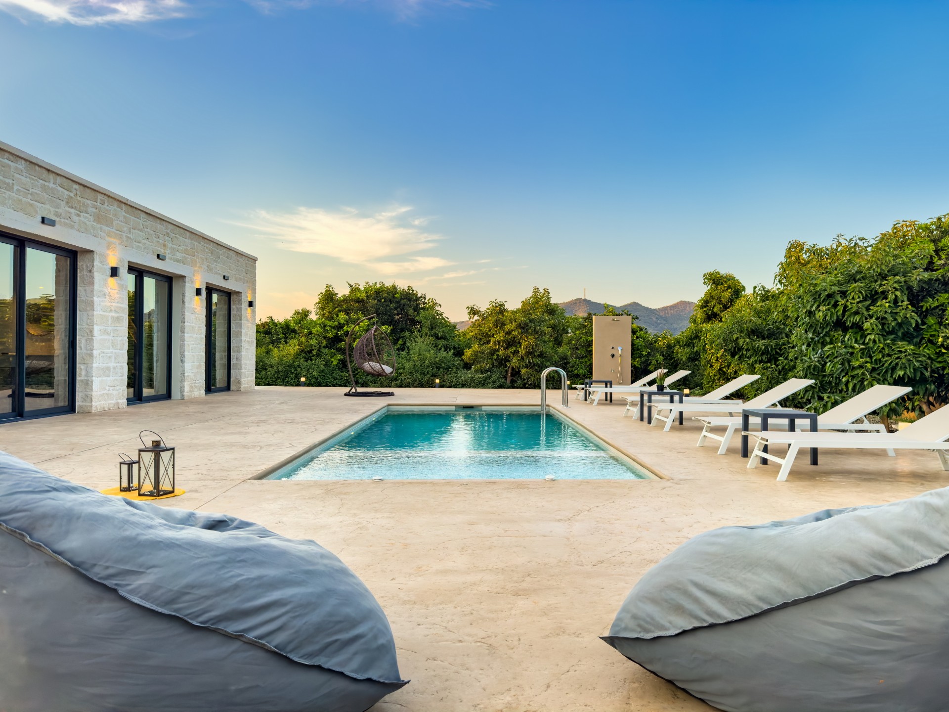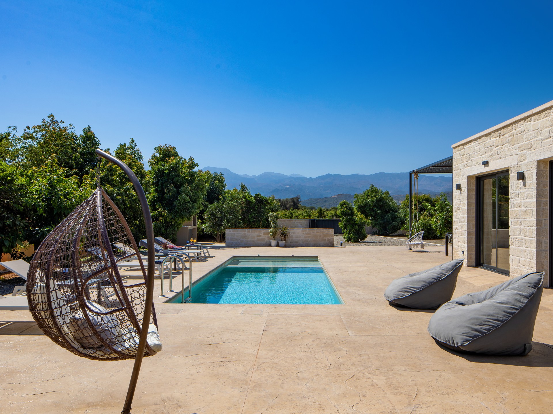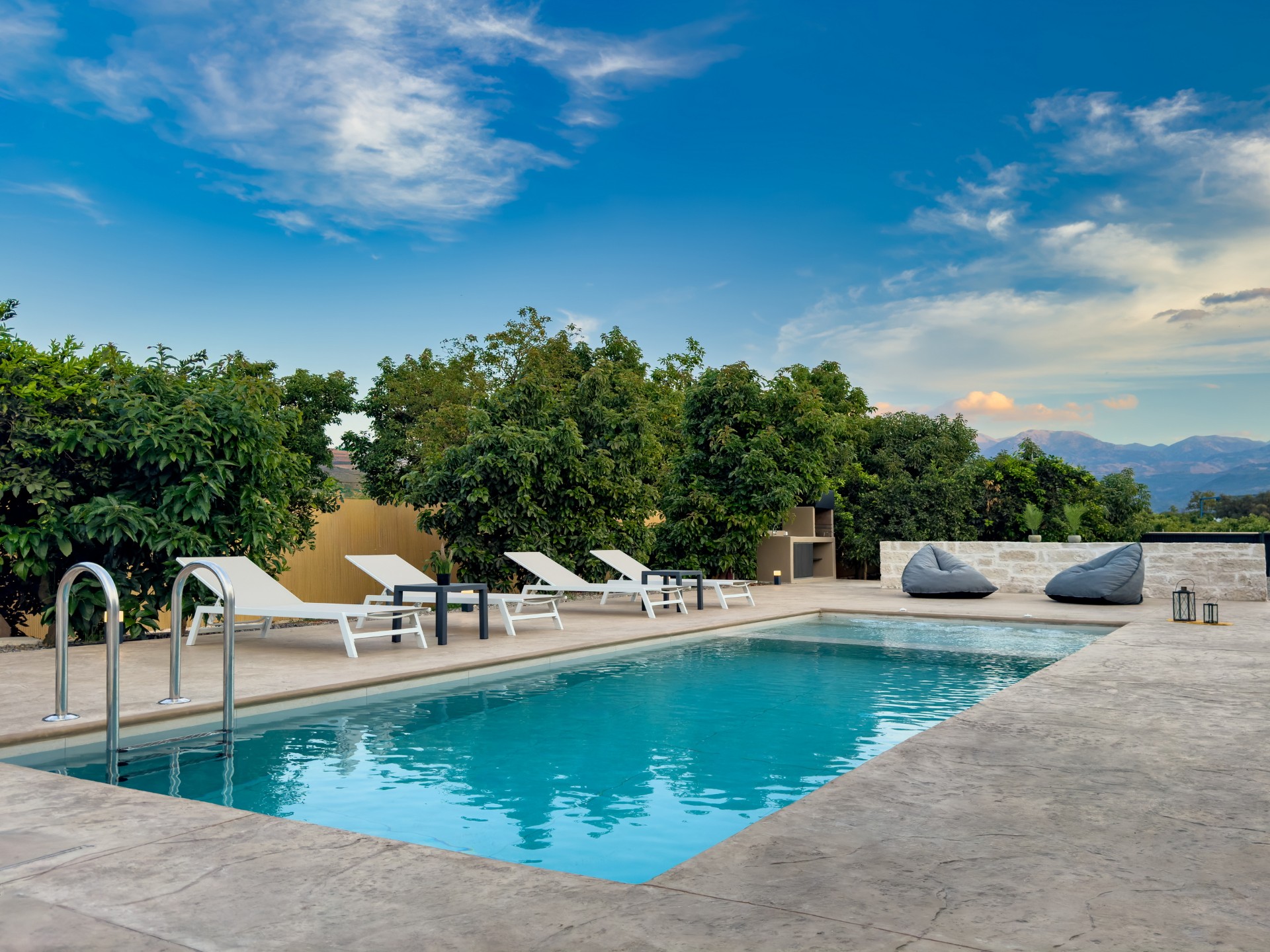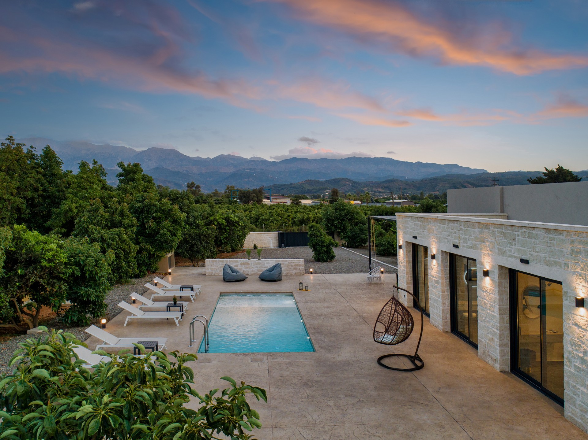 Discover the Aurora luxury villa surrounded by citrus groves and mountain views in the Cretan countryside. designed for comfort and style, it features three elegant bedrooms, spa-inspired bathrooms, a modern kitchen, and bright living spaces with direct access to the pool. outside, relax by your private swimming pool, enjoy the BBQ and shaded dining area, and experience the perfect blend of tranquility and modern luxury just a short drive from Chania city.