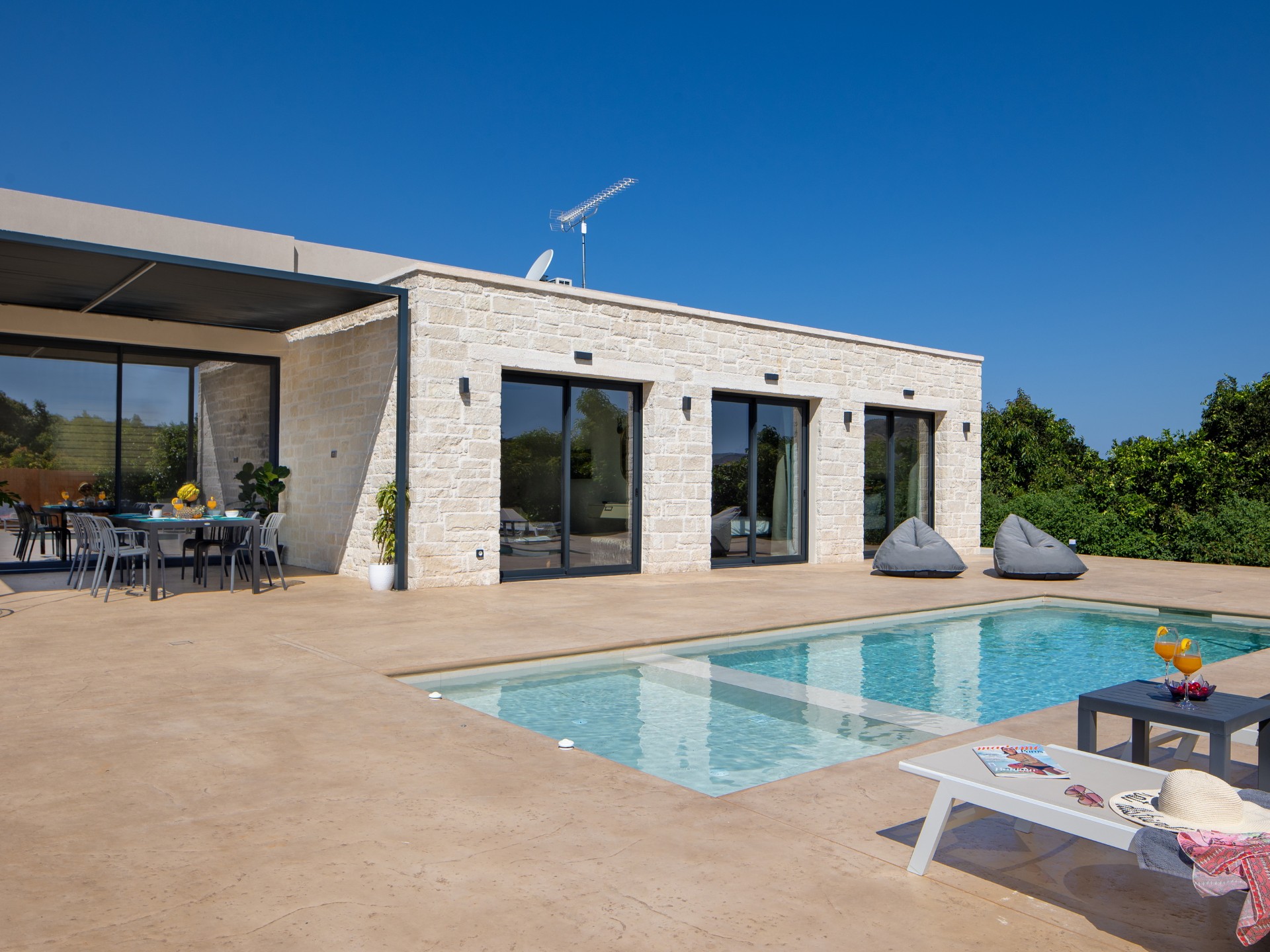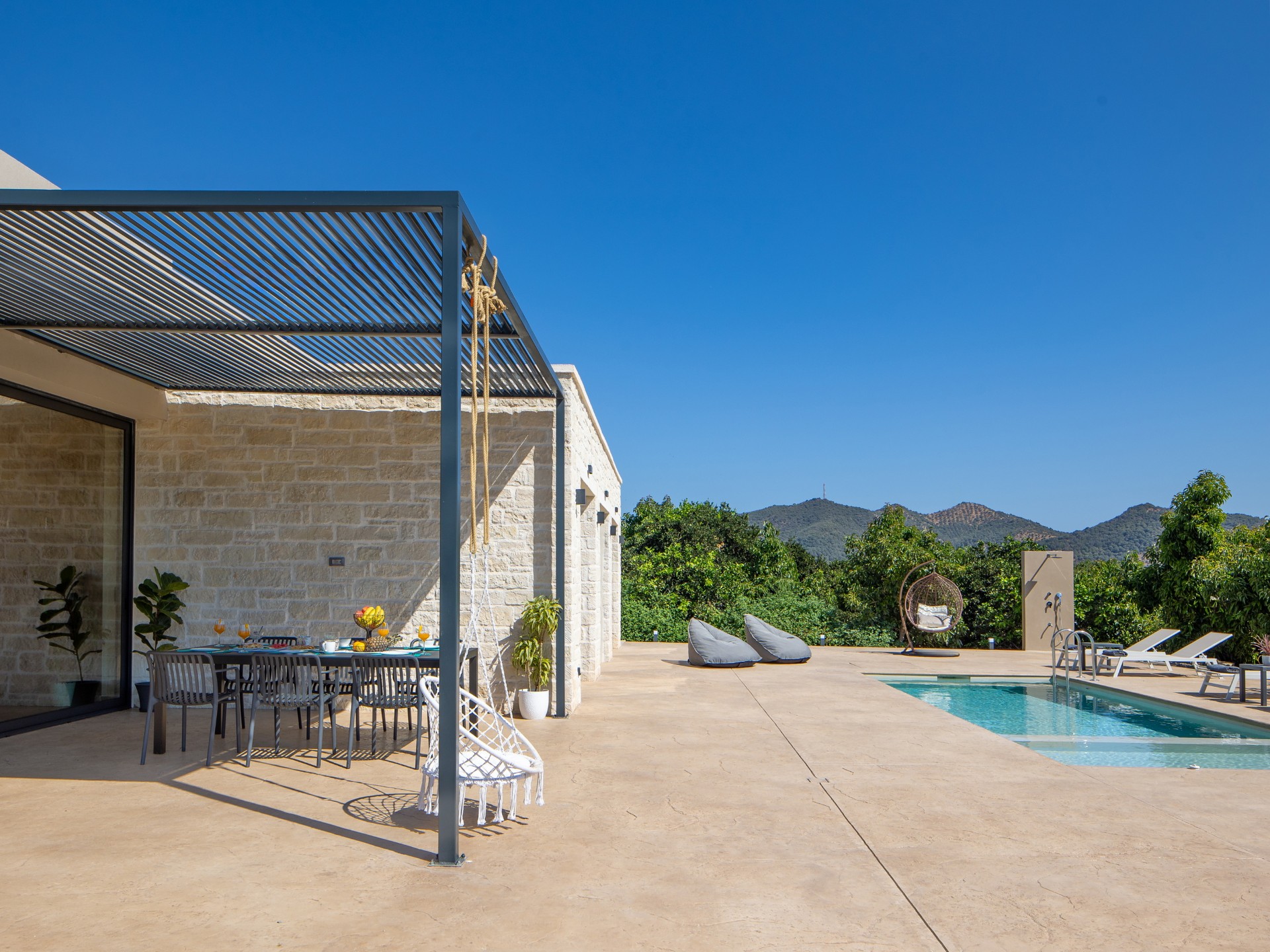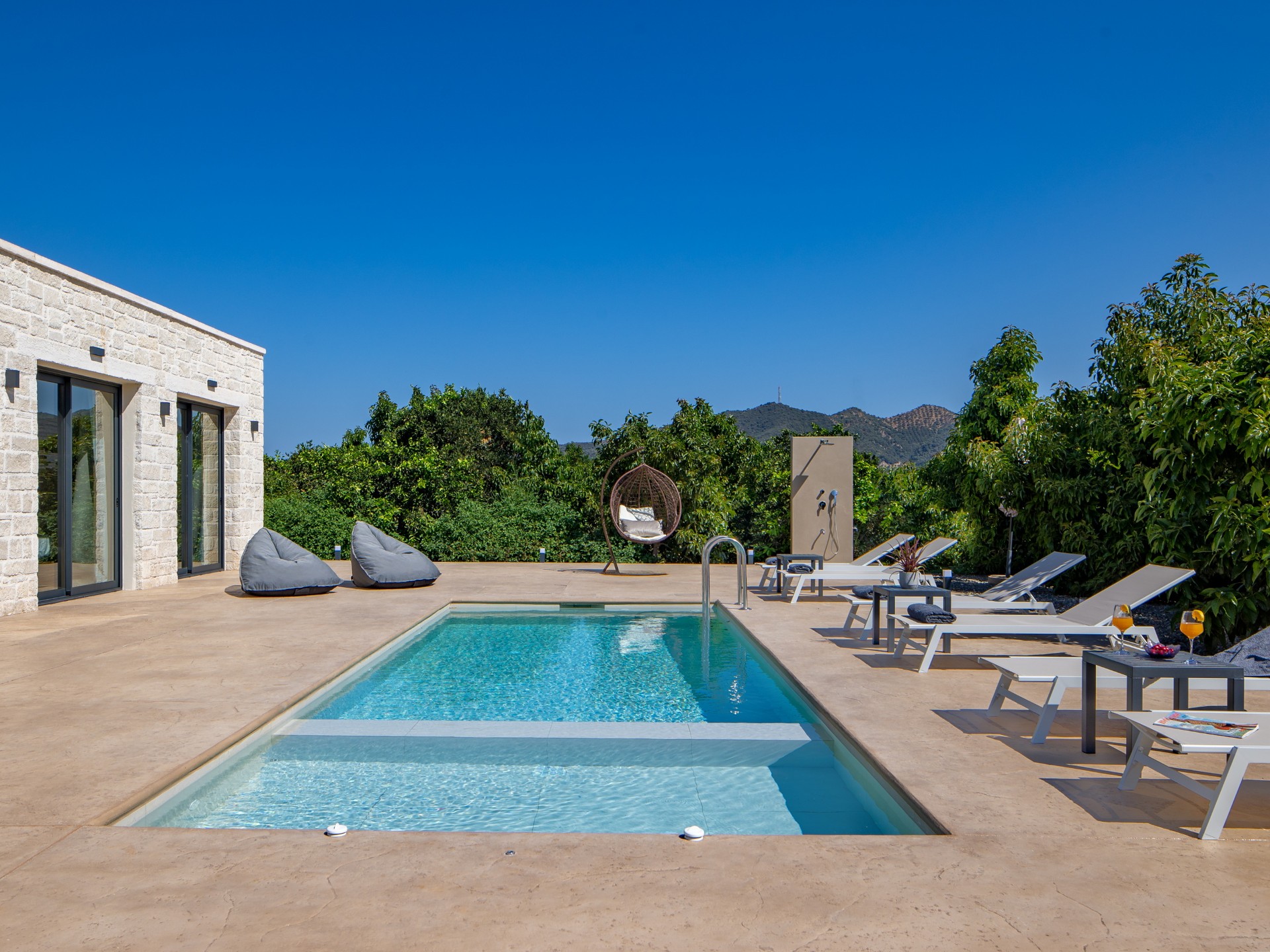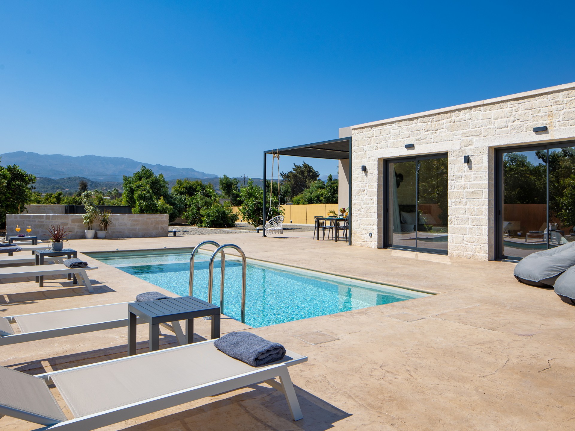 Discover the Aurora luxury villa surrounded by citrus groves and mountain views in the Cretan countryside. designed for comfort and style, it features three elegant bedrooms, spa-inspired bathrooms, a modern kitchen, and bright living spaces with direct access to the pool. outside, relax by your private swimming pool, enjoy the BBQ and shaded dining area, and experience the perfect blend of tranquility and modern luxury just a short drive from Chania city.