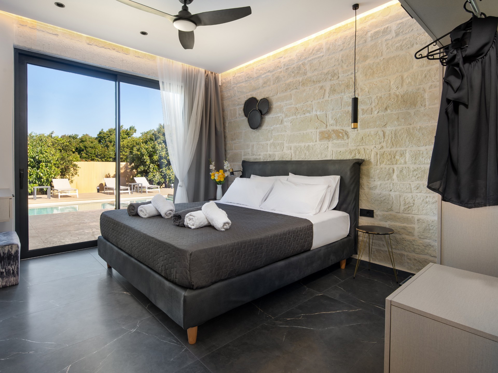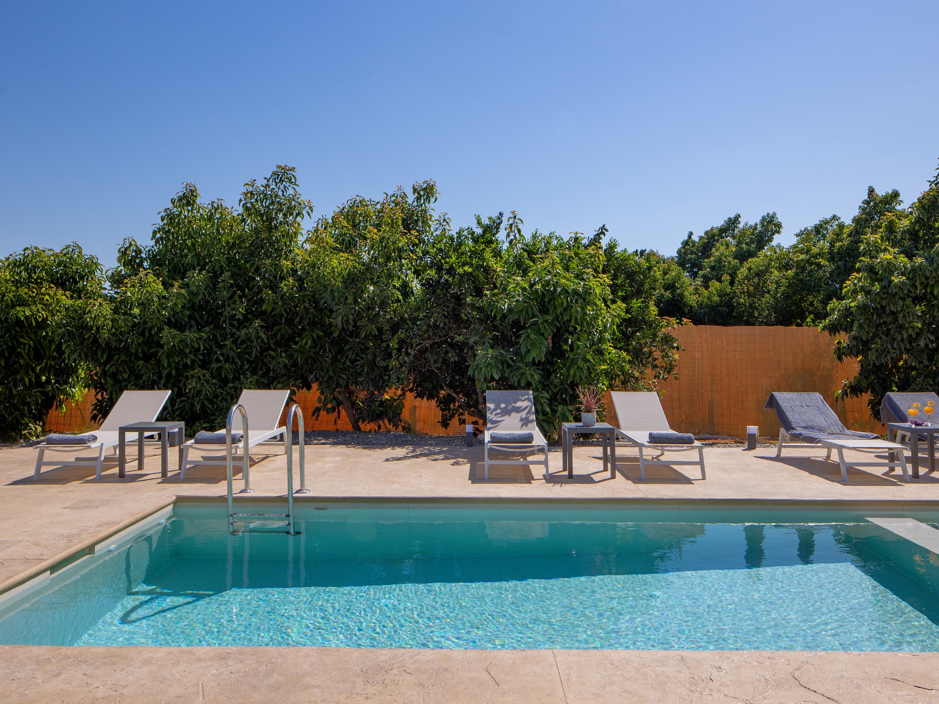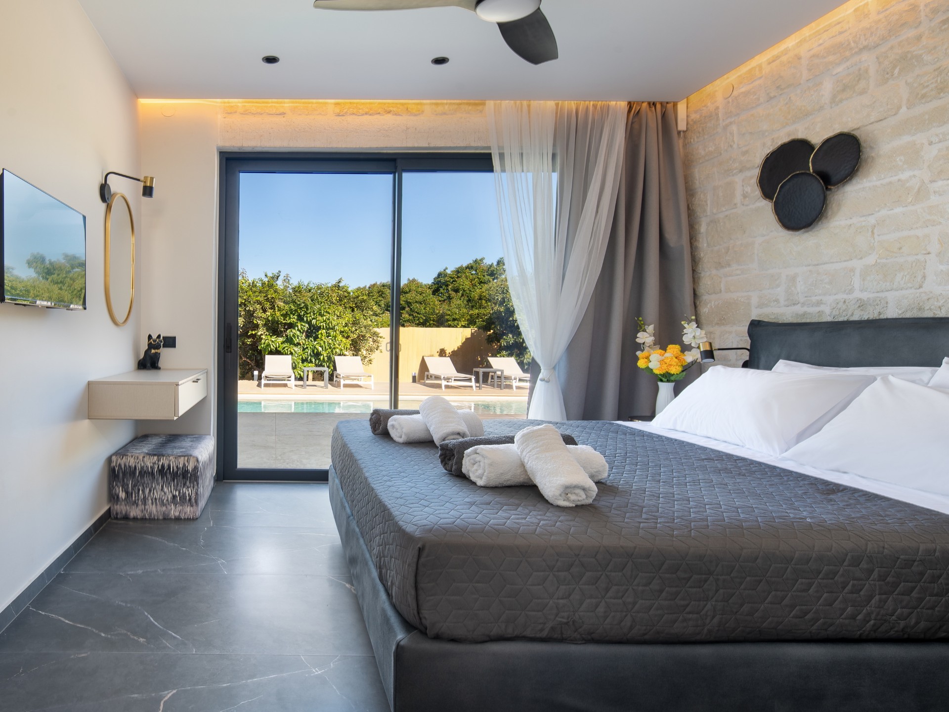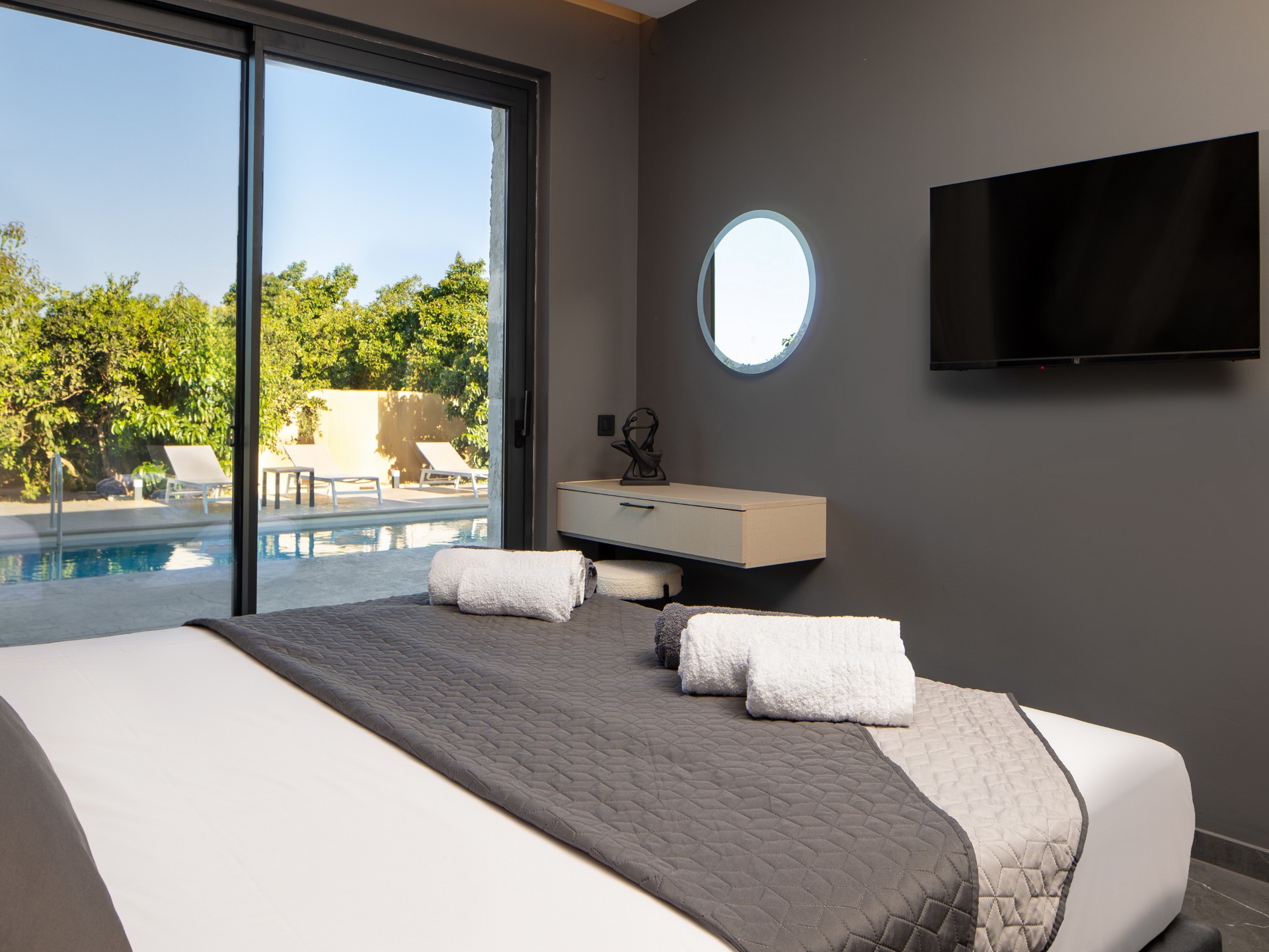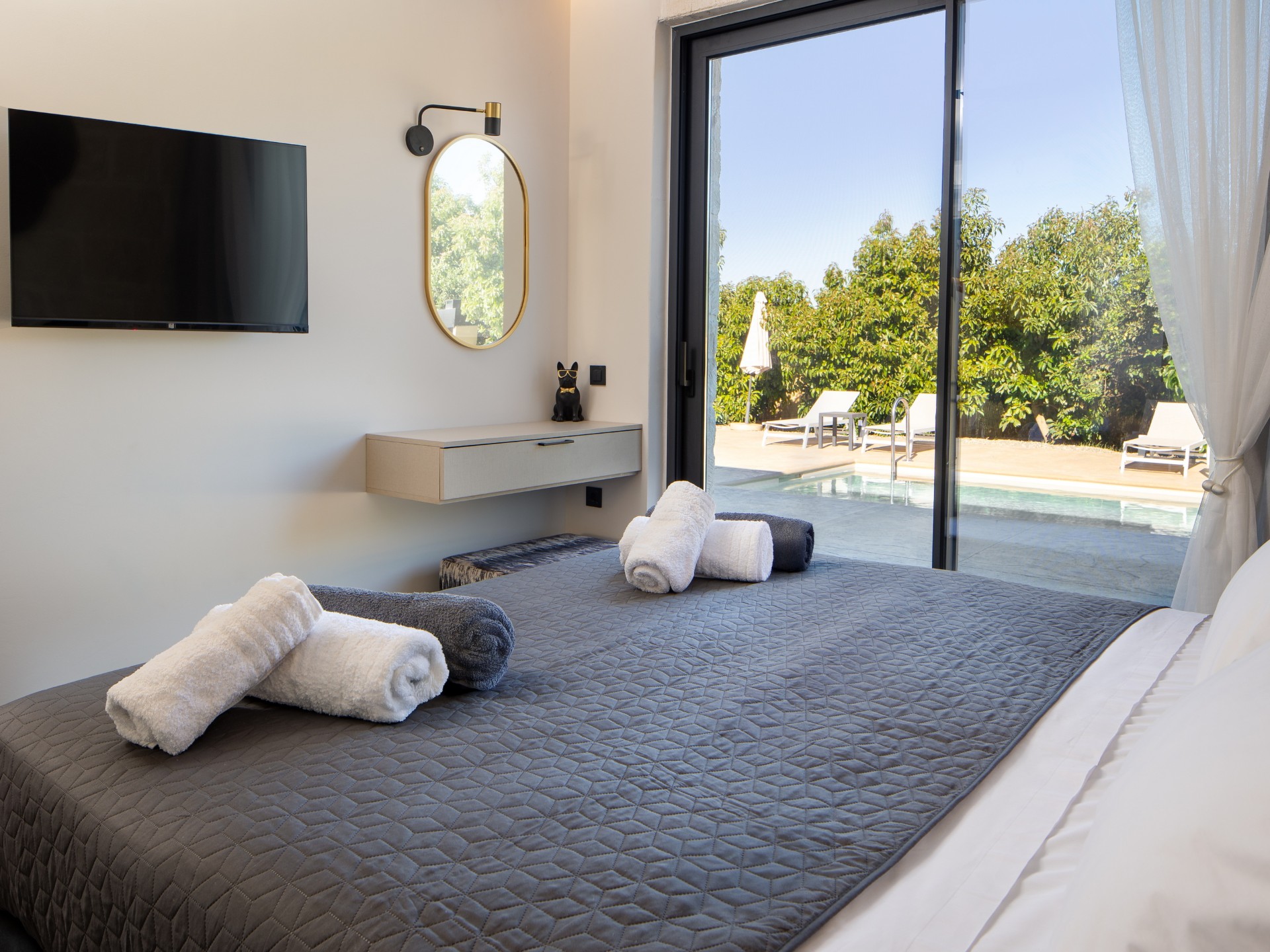 Discover the Aurora luxury villa surrounded by citrus groves and mountain views in the Cretan countryside. designed for comfort and style, it features three elegant bedrooms, spa-inspired bathrooms, a modern kitchen, and bright living spaces with direct access to the pool. outside, relax by your private swimming pool, enjoy the BBQ and shaded dining area, and experience the perfect blend of tranquility and modern luxury just a short drive from Chania city.