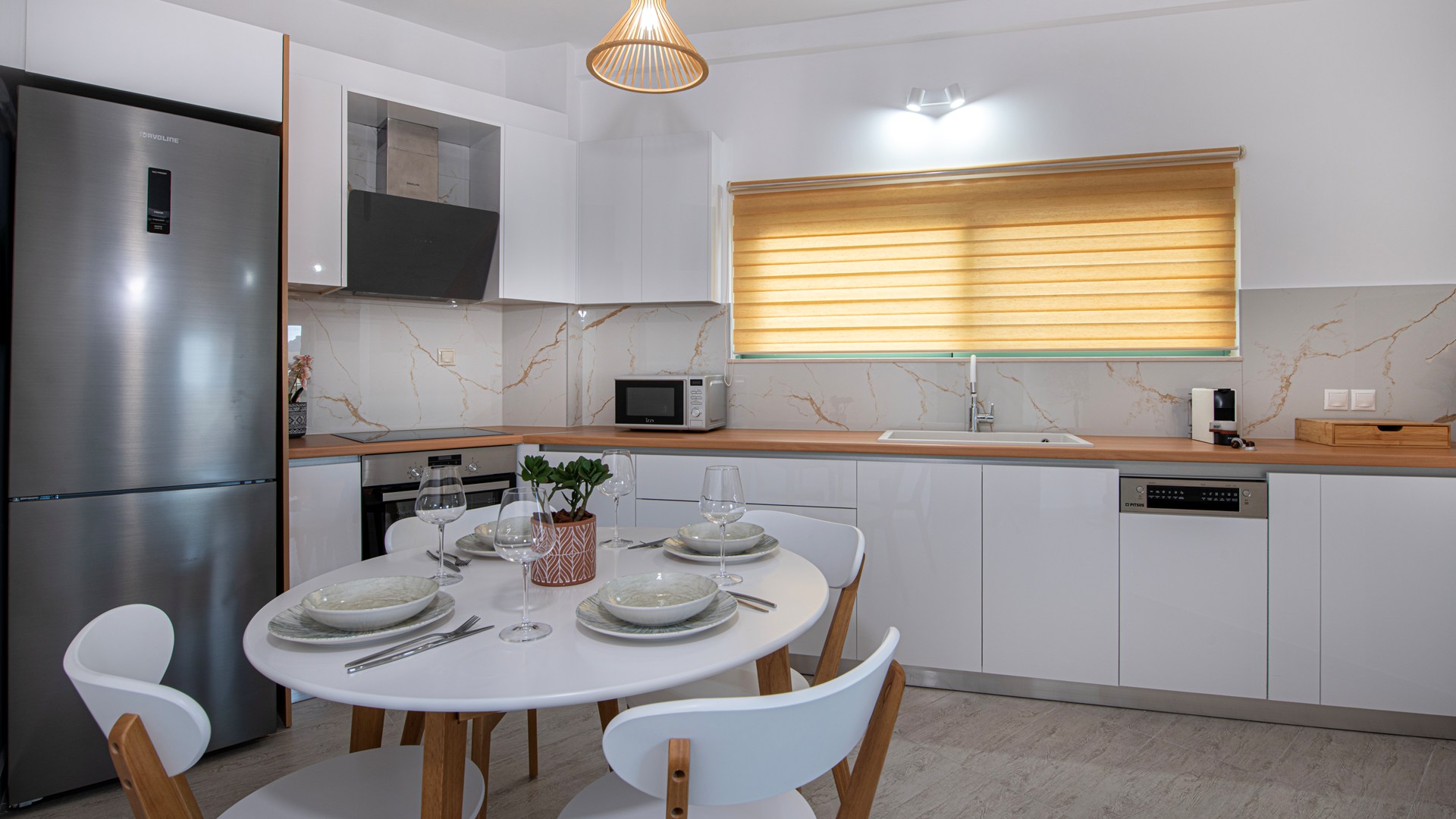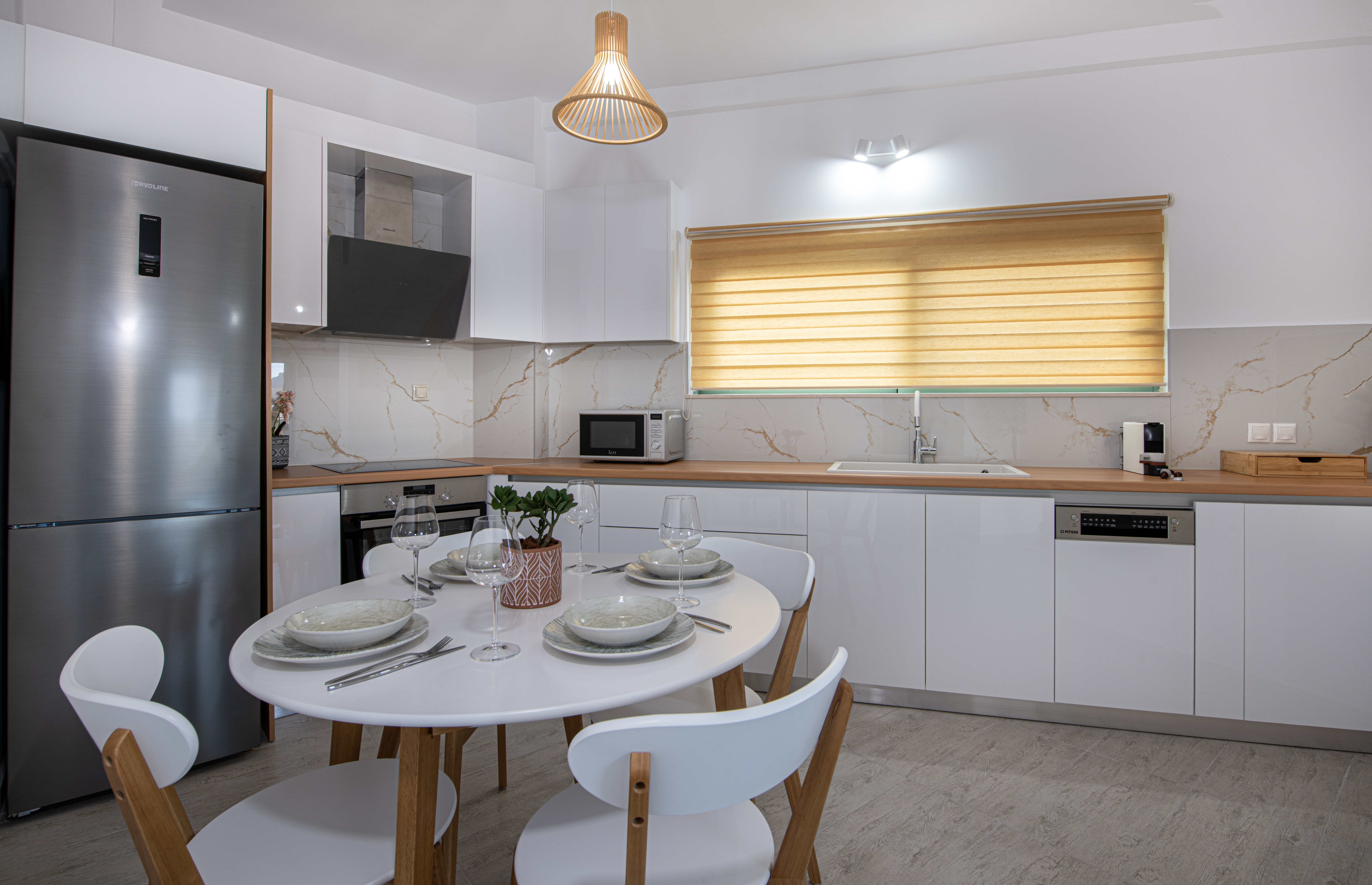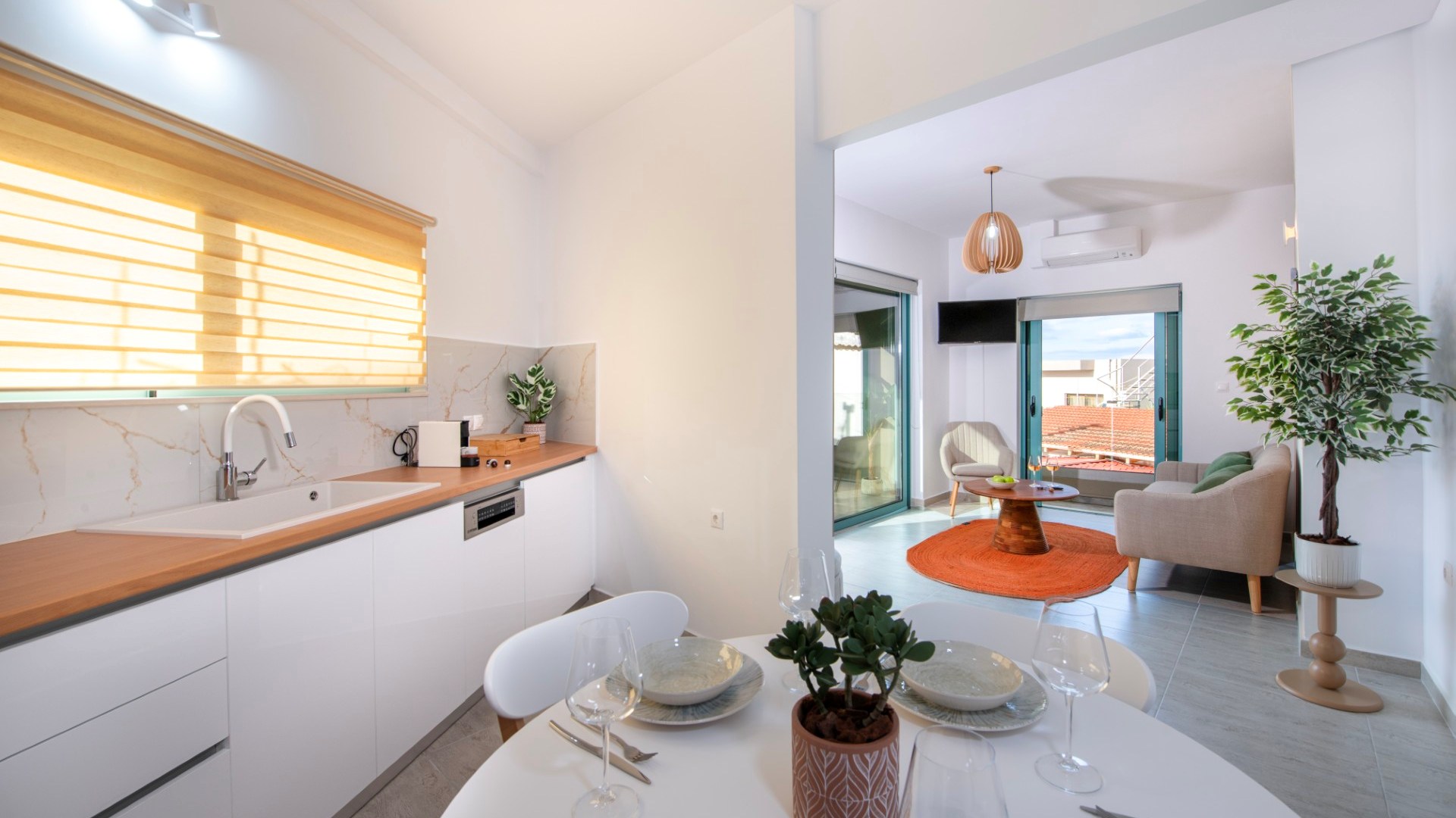 Experience a BRAND NEW 2025 coastal apartment in the sought after NEA CHORA area of Chania, created with a clean MINIMALIST DESIGN, warm wood finishes, and plenty of NATURAL LIGHT. Thoughtfully planned for comfort and functionality, the home features an open KITCHEN AND LIVING AREA with a fully equipped KITCHEN and a DINING TABLE FOR FOUR GUESTS, ideal for relaxed meals and easy everyday living.