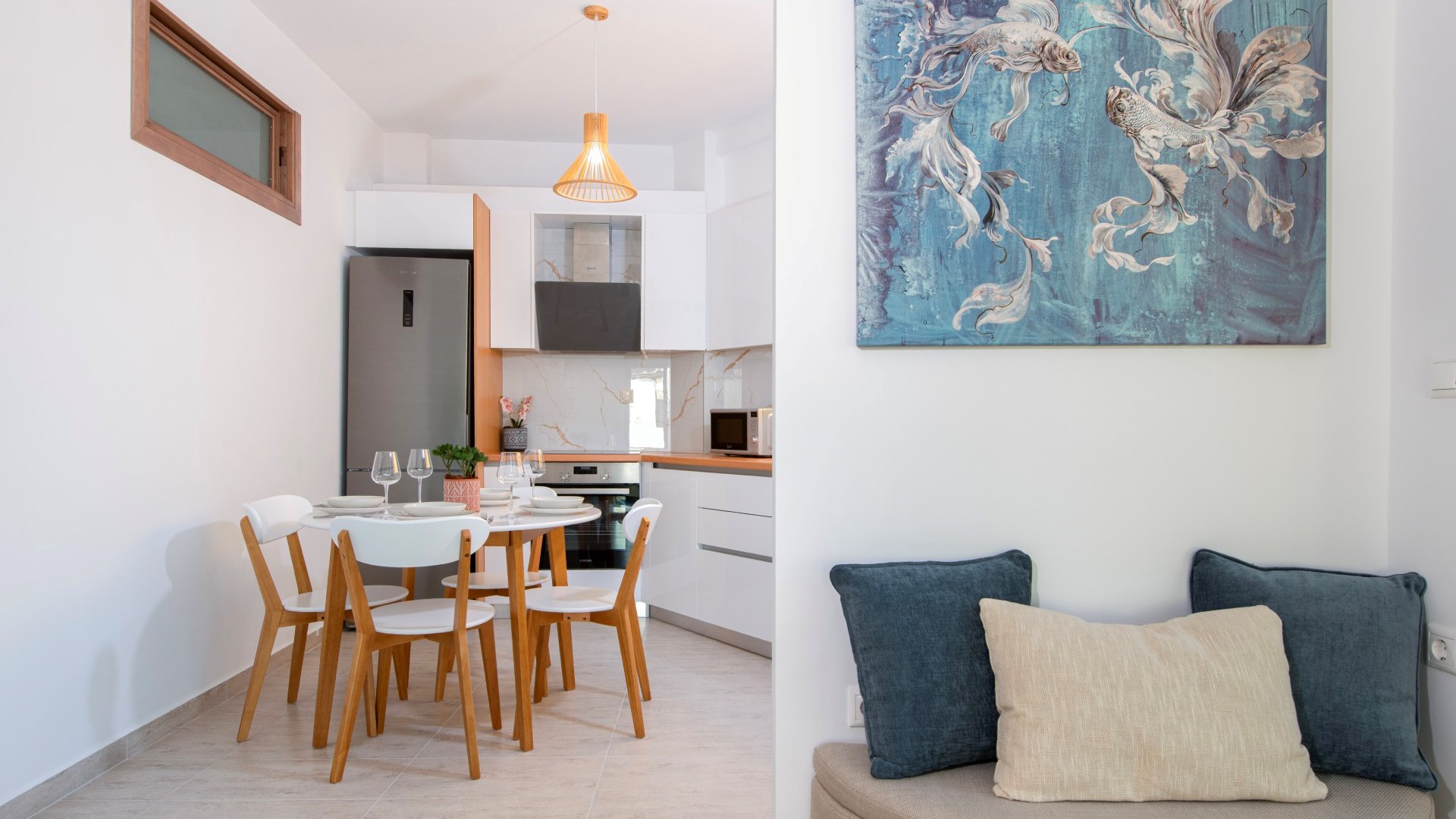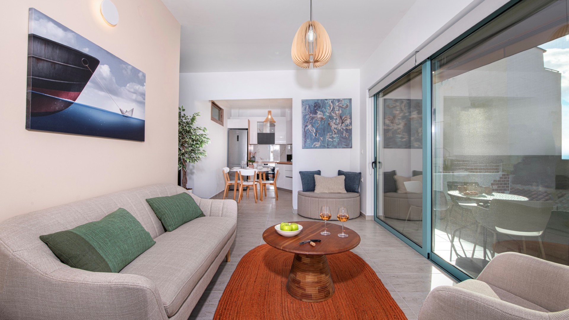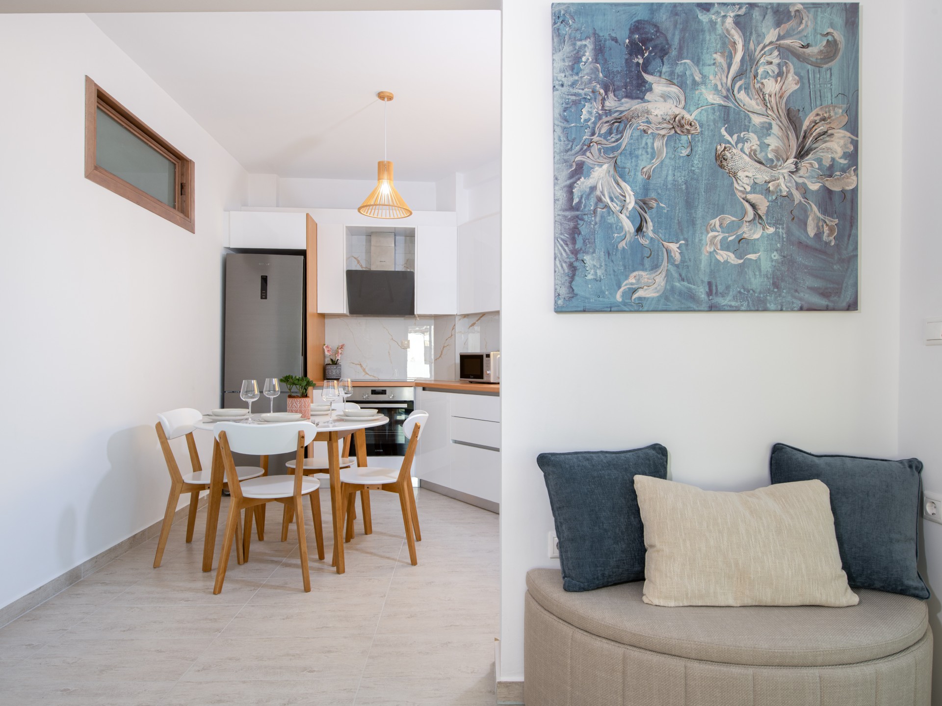 Experience a BRAND NEW 2025 coastal apartment in the sought after NEA CHORA area of Chania, created with a clean MINIMALIST DESIGN, warm wood finishes, and plenty of NATURAL LIGHT. Thoughtfully planned for comfort and functionality, the home features an open KITCHEN AND LIVING AREA with a fully equipped KITCHEN and a DINING TABLE FOR FOUR GUESTS, ideal for relaxed meals and easy everyday living.