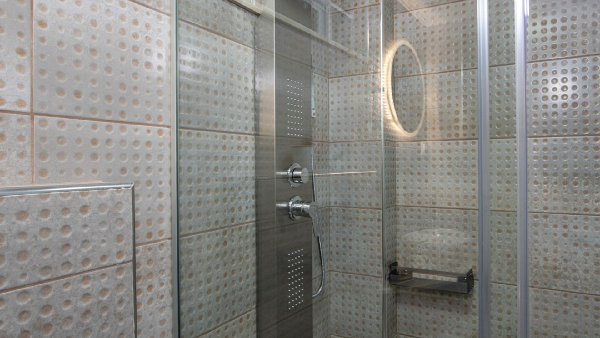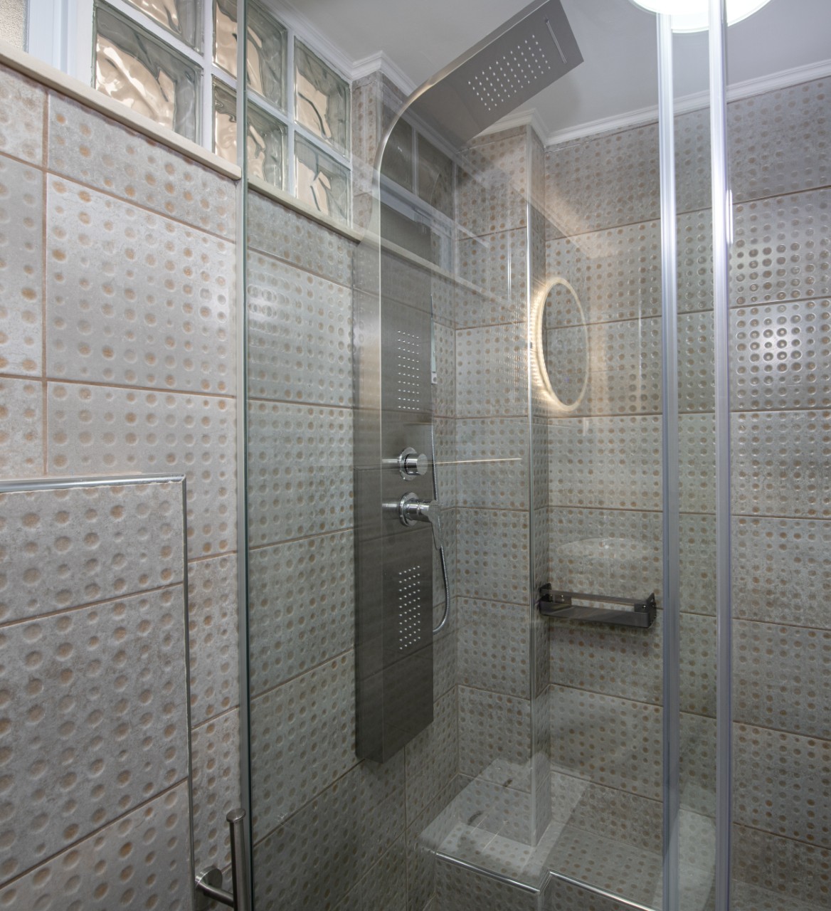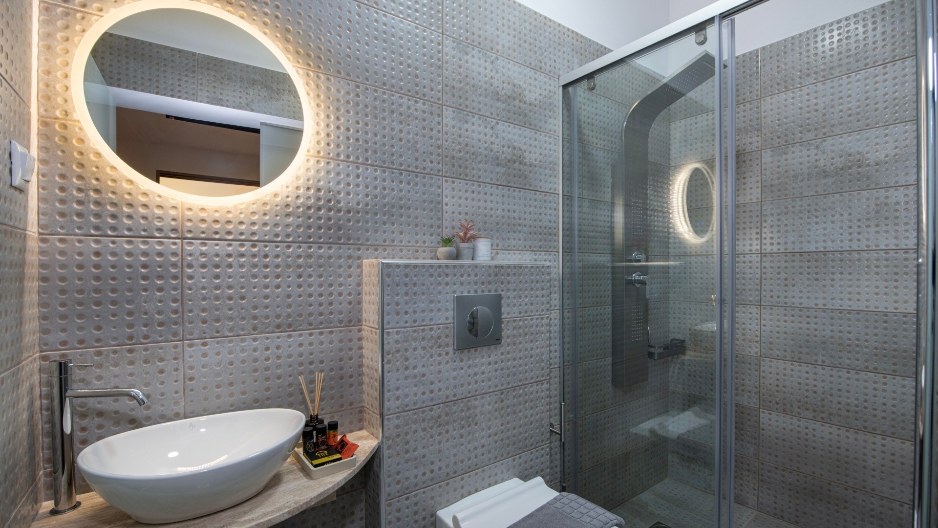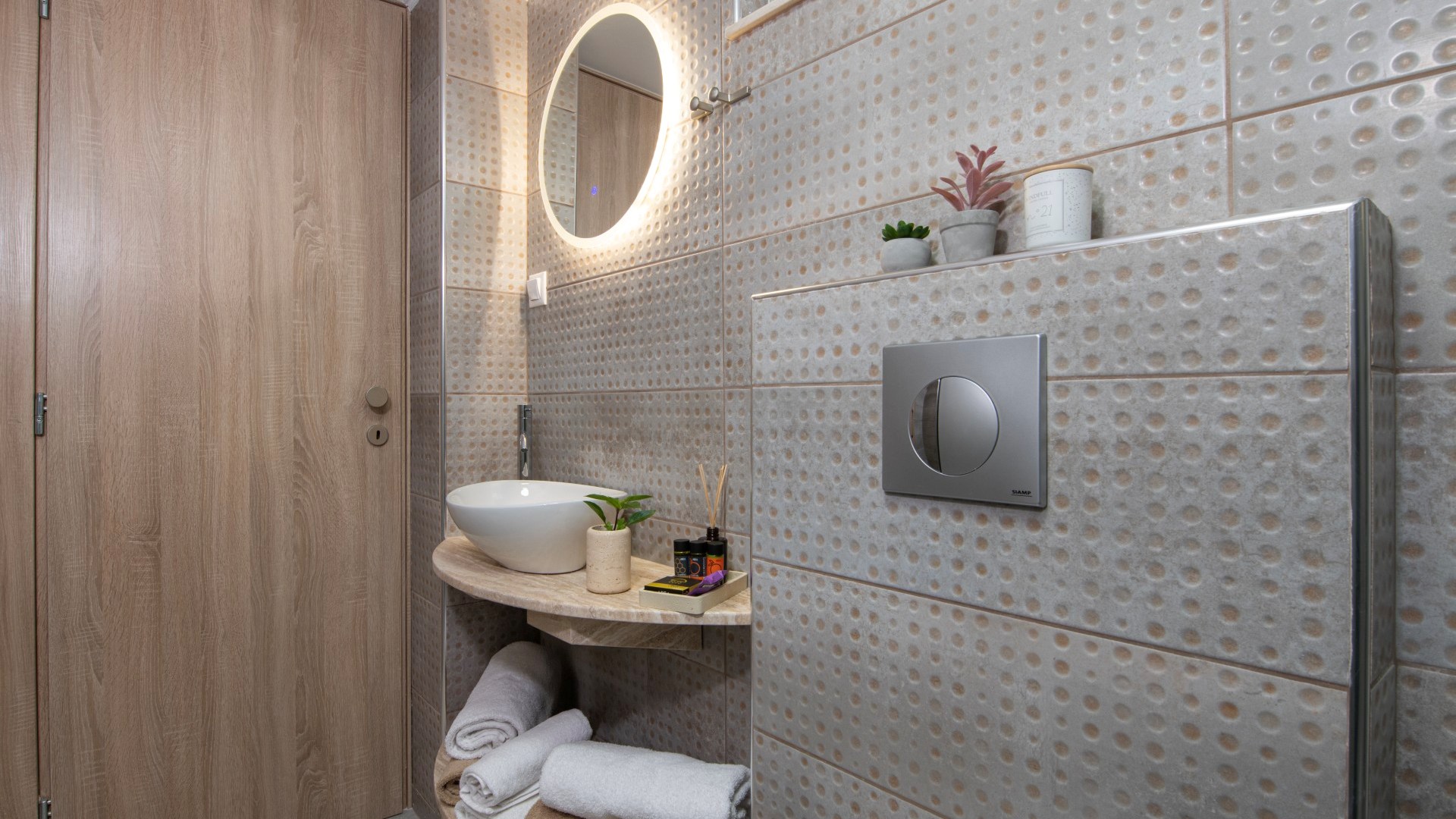 The apartment offers TWO COMFORTABLE BEDROOMS, a sleek MAIN BATHROOM, and an additional PRIVATE EN SUITE SHOWER ROOM in BEDROOM 1 for extra privacy. BEDROOM 2 opens onto a small private BALCONY TERRACE, perfect for a quiet coffee or fresh air. Step outside to the private SEA VIEW BALCONY for outdoor dining and a lovely GLIMPSE OF THE SEA, and enjoy being only 40 m FROM NEA CHORA BEACH, close to seaside walks and waterfront tavernas. A dedicated PRIVATE PARKING SPOT is included for stress-free arrivals.