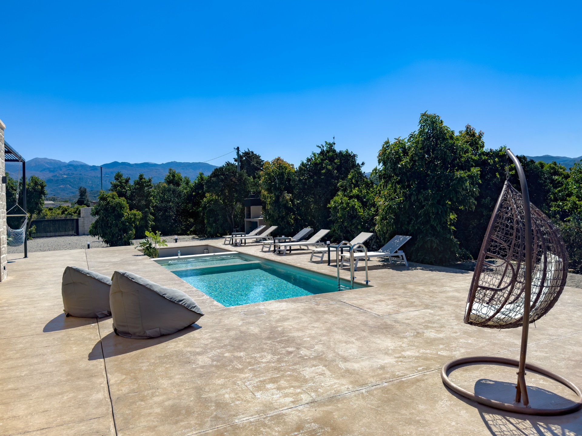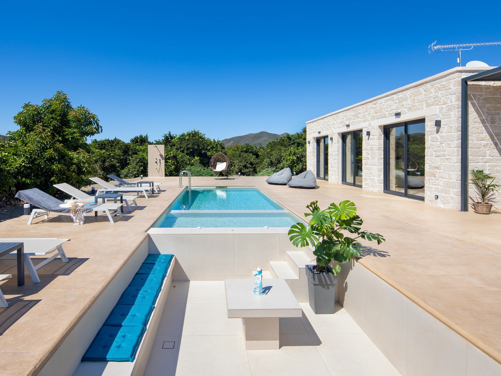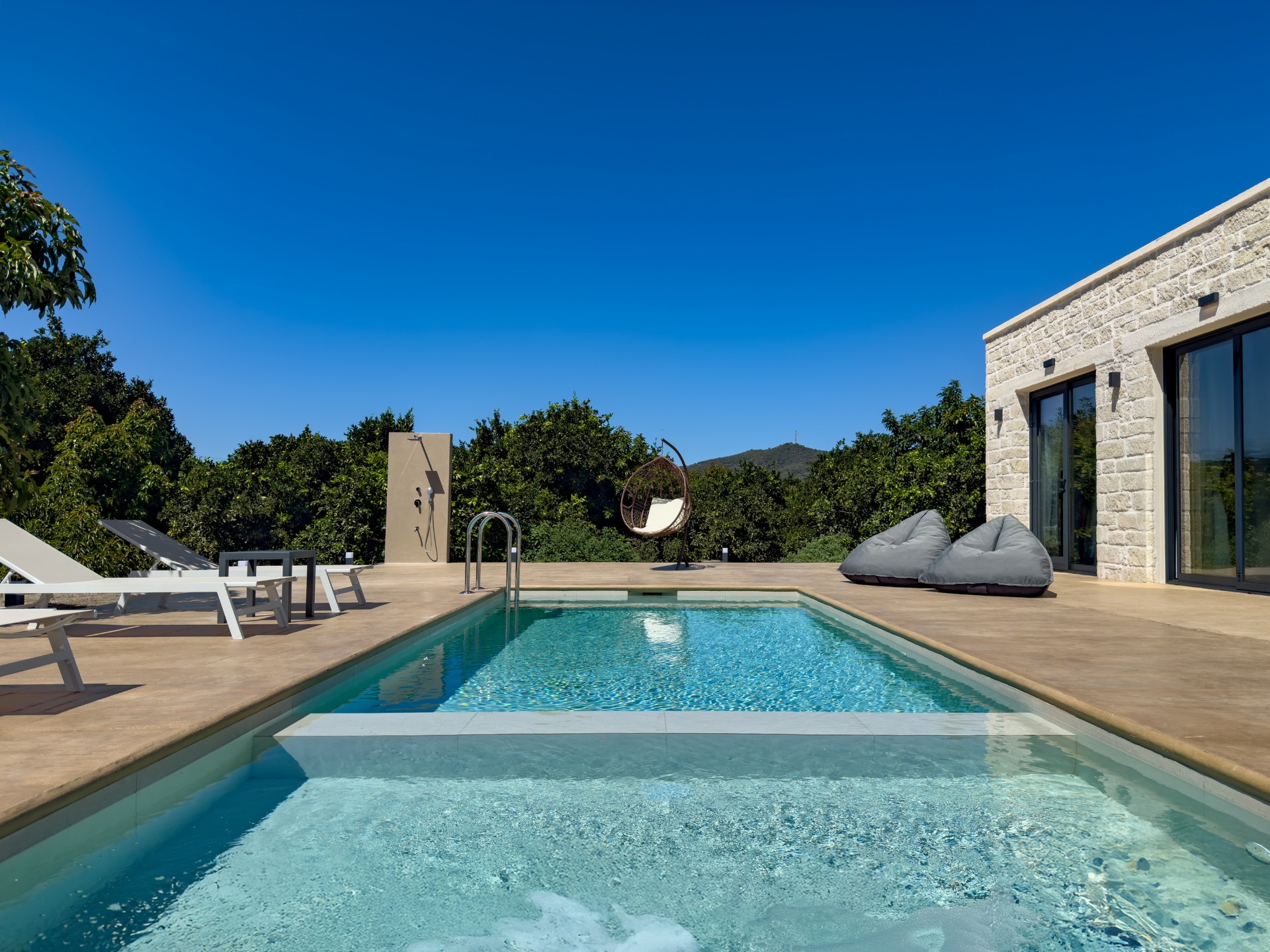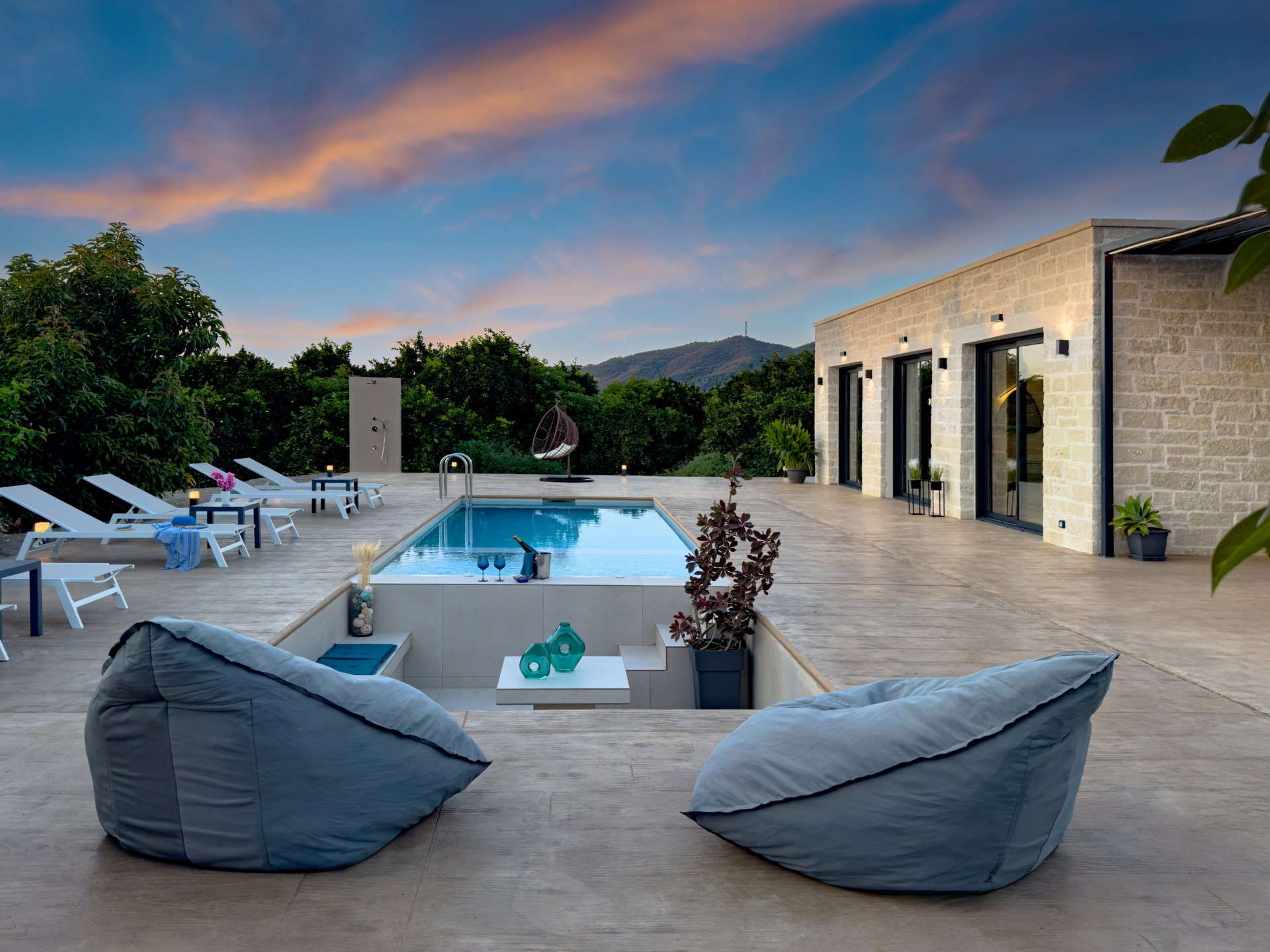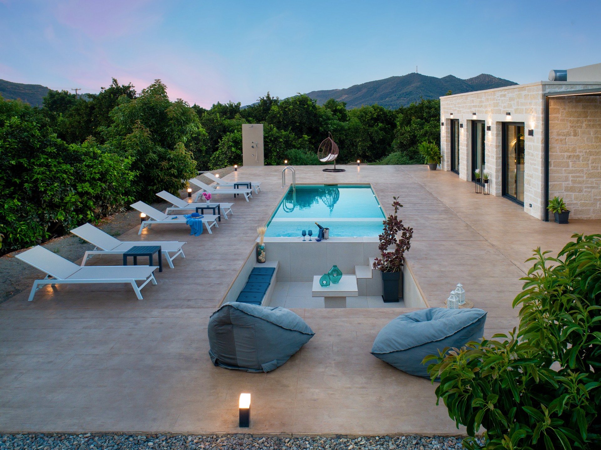 Escape to a modern retreat set in the tranquil village of Agia, surrounded by lush groves and mountain scenery. This elegant villa offers three stylish bedrooms, marble-topped bathrooms, a fully equipped kitchen, and open living areas bathed in natural light. Step outside to your private pool with a jacuzzi section, unwind in the elegant built-in lounge by the water, a perfect spot for morning coffee or evening cocktails, relax under the pergola, just 15 minutes from Chania’s vibrant old town.