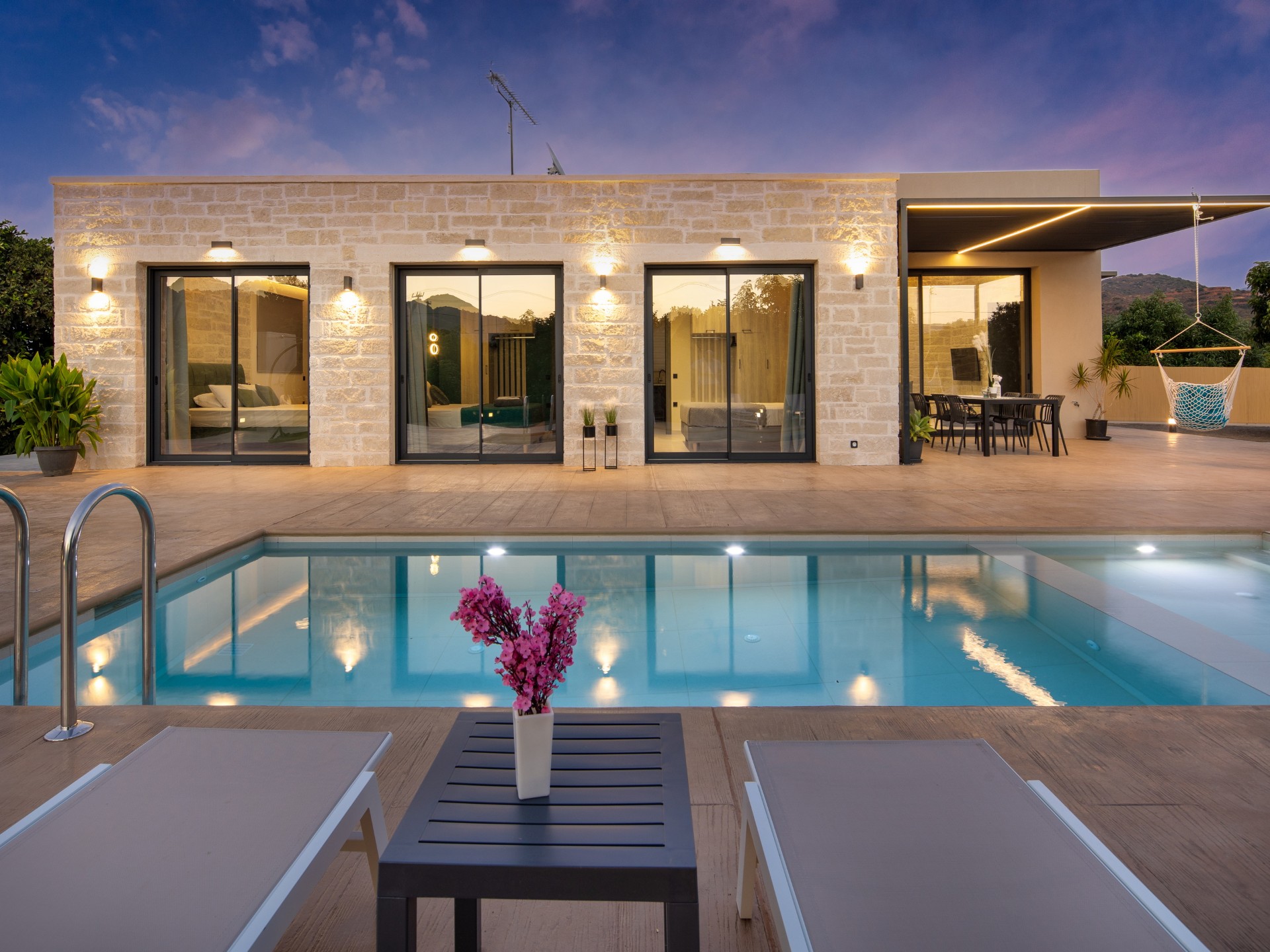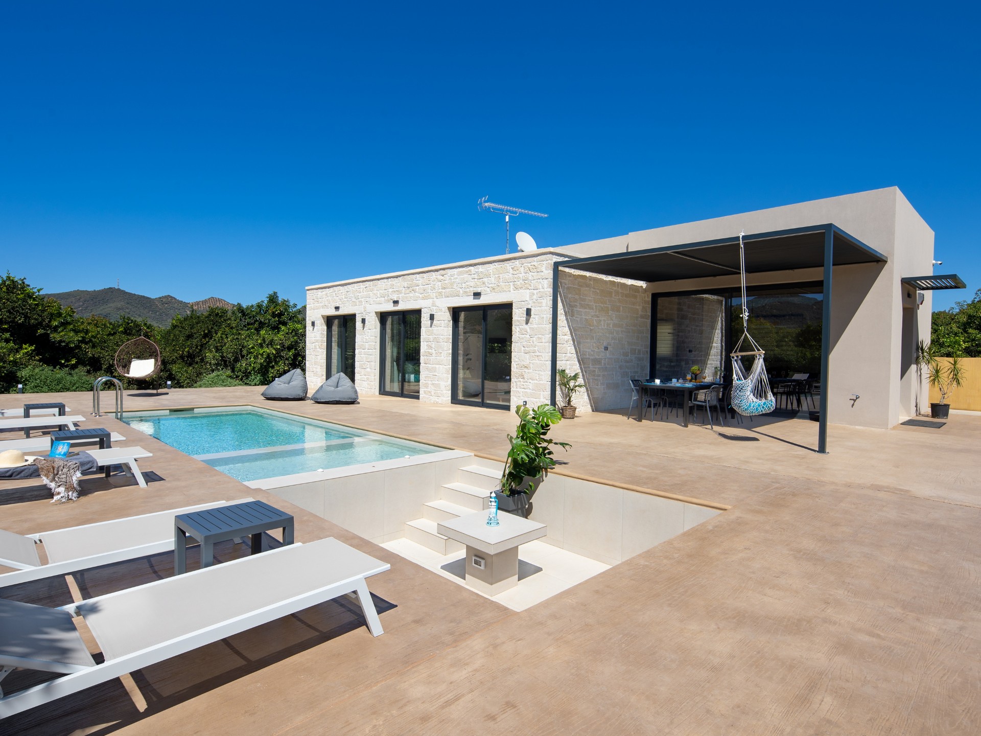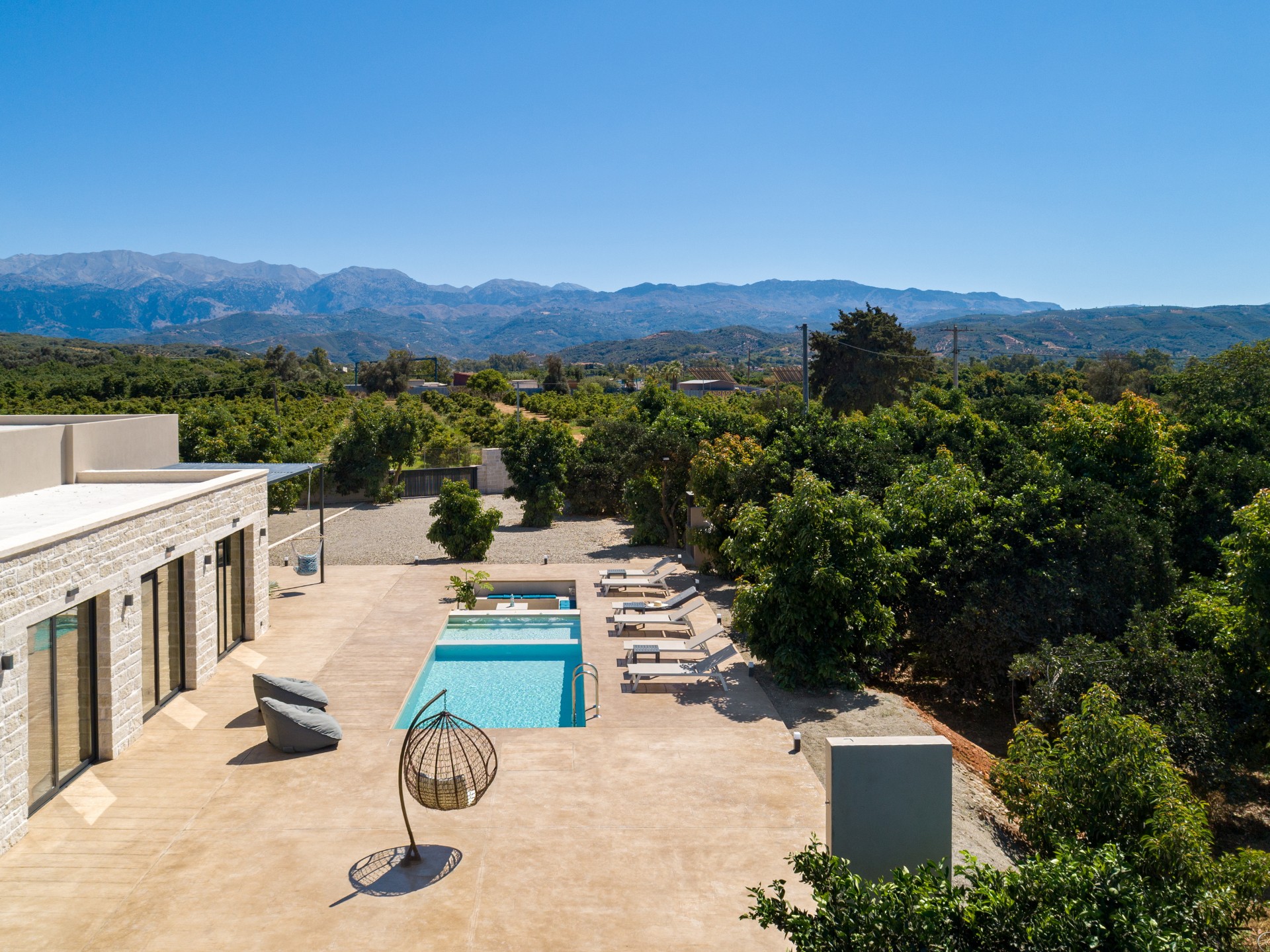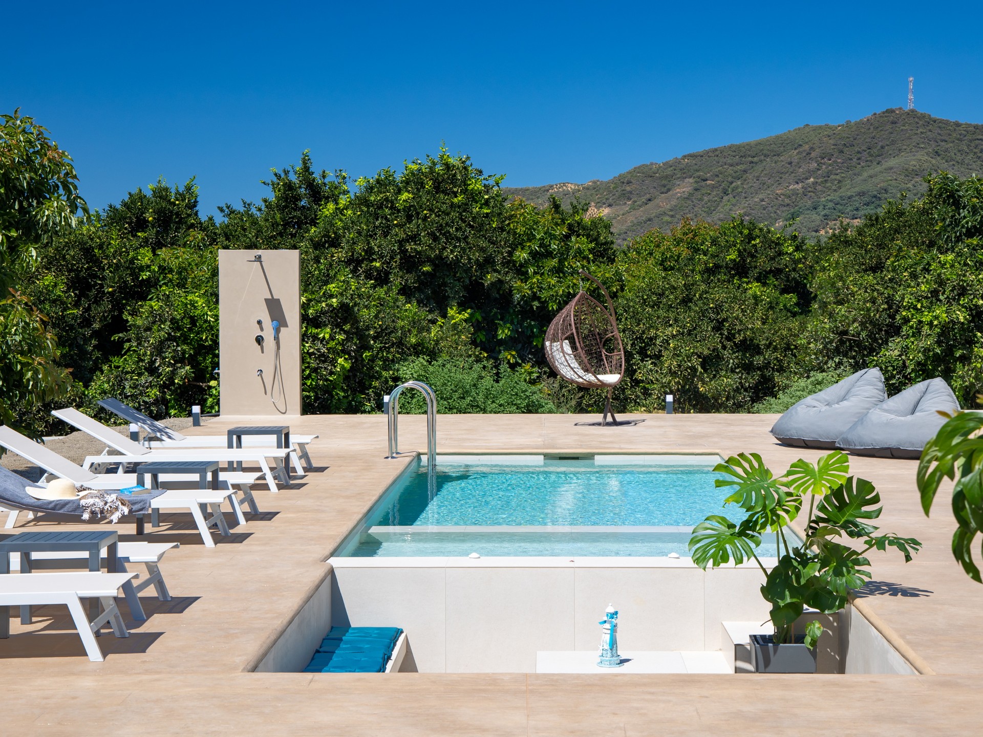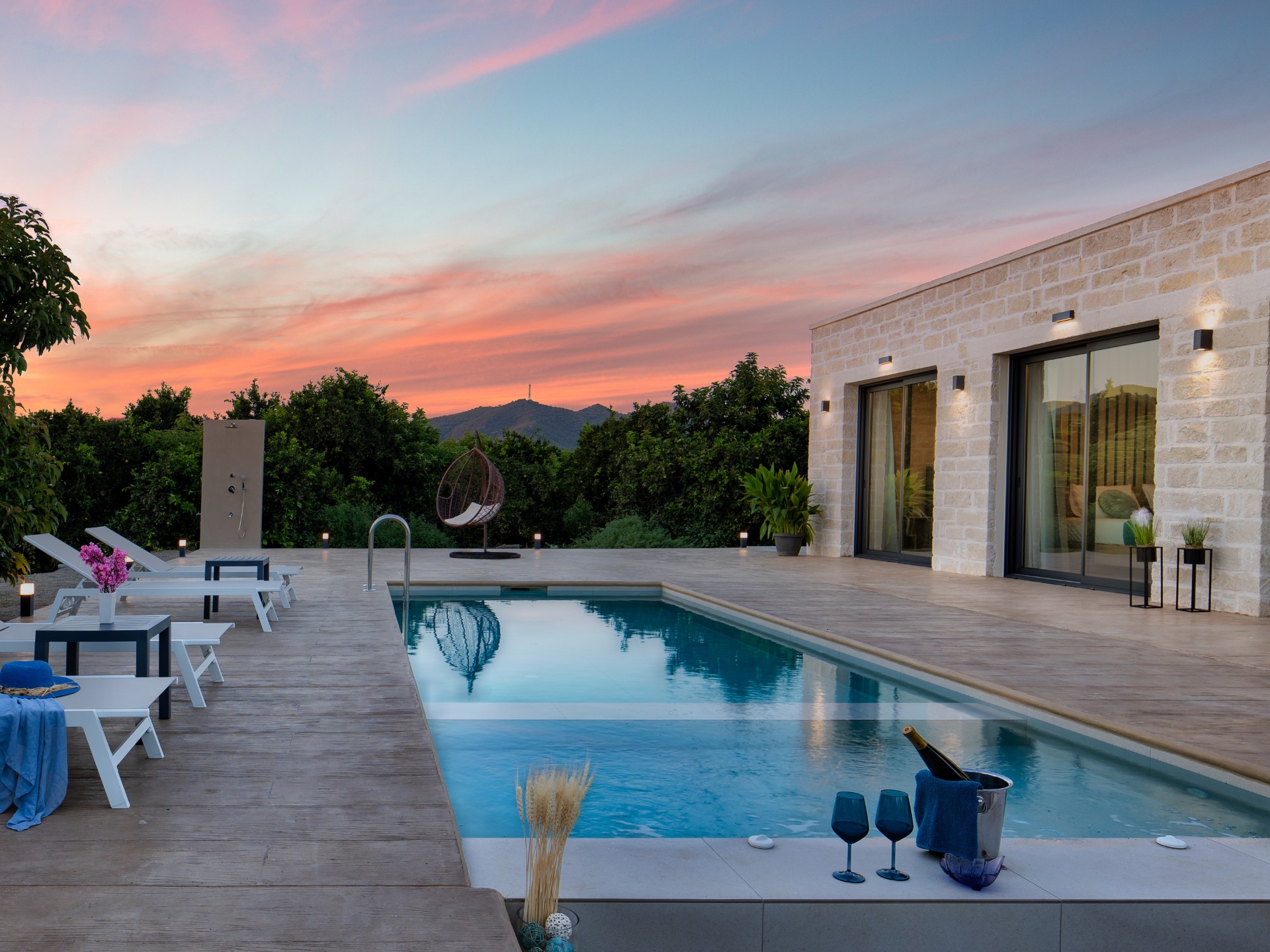 Escape to a modern retreat set in the tranquil village of Agia, surrounded by lush groves and mountain scenery. This elegant villa offers three stylish bedrooms, marble-topped bathrooms, a fully equipped kitchen, and open living areas bathed in natural light. Step outside to your private pool with a jacuzzi section, unwind in the elegant built-in lounge by the water, a perfect spot for morning coffee or evening cocktails, relax under the pergola, just 15 minutes from Chania’s vibrant old town.