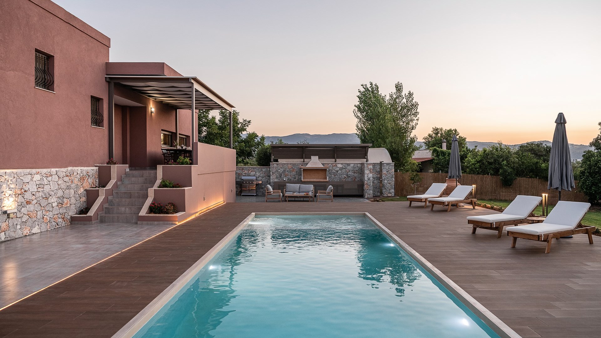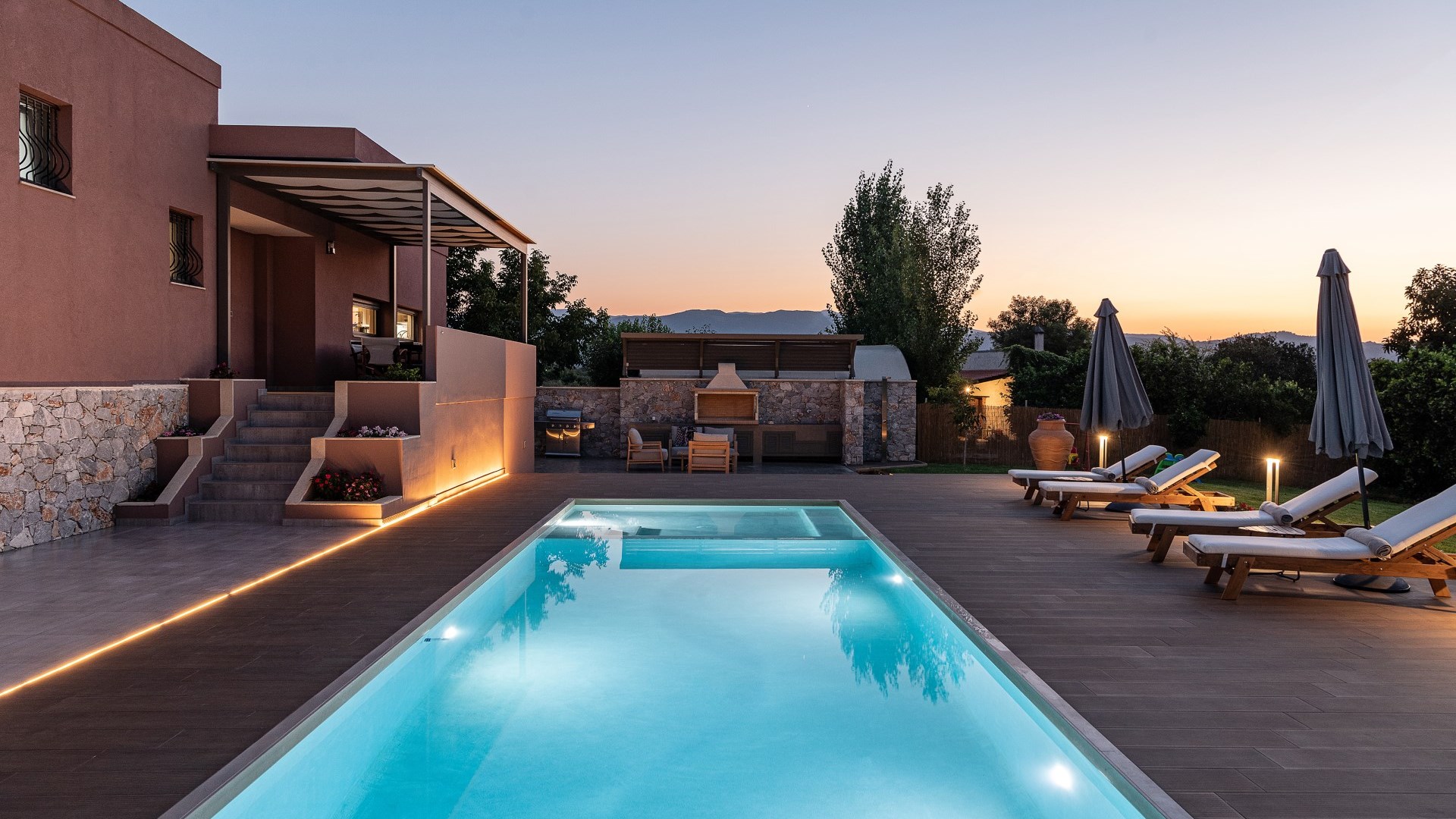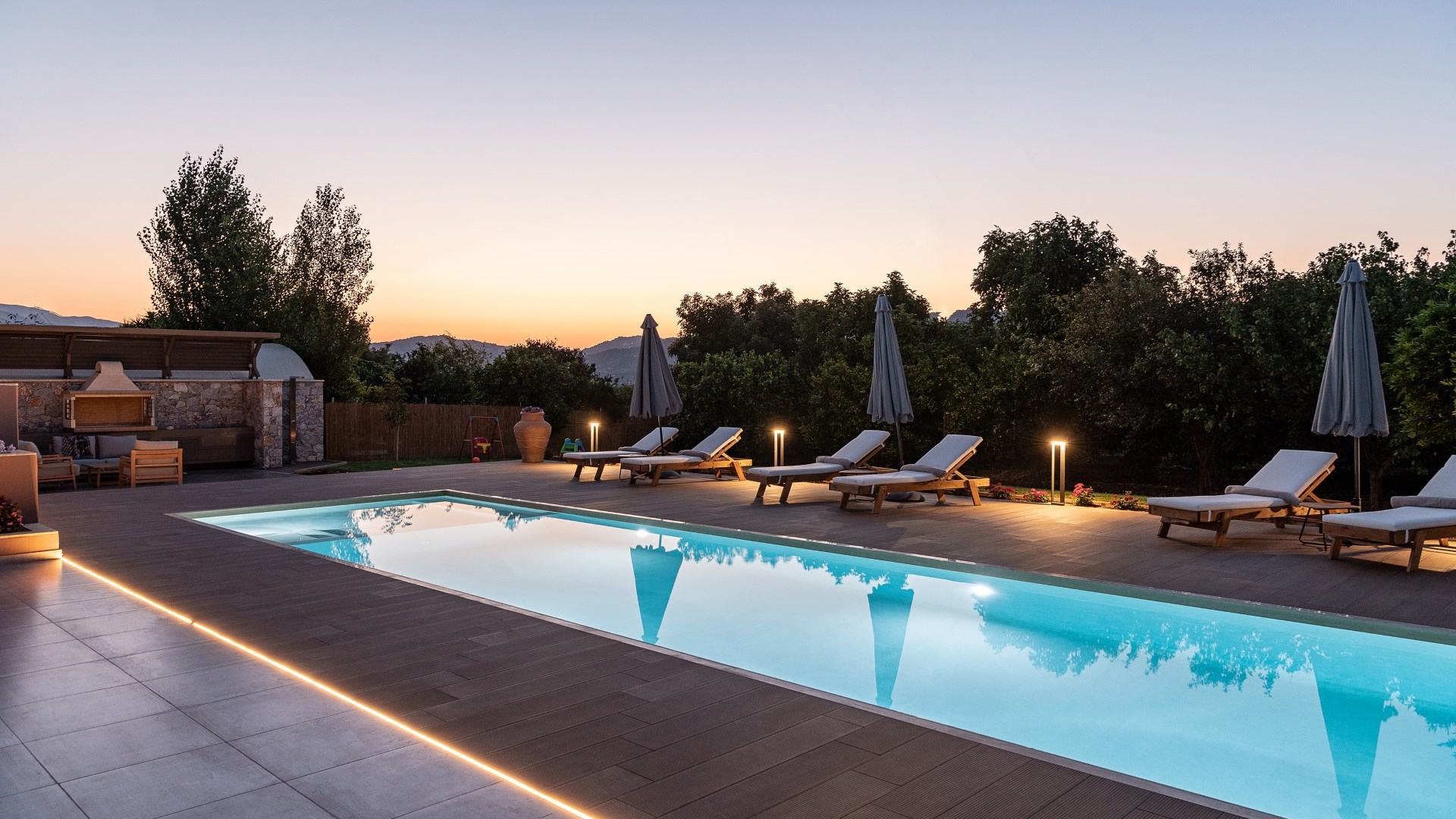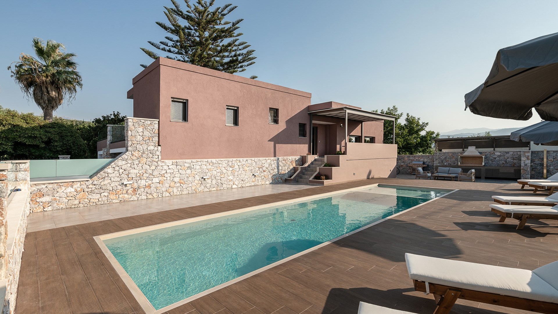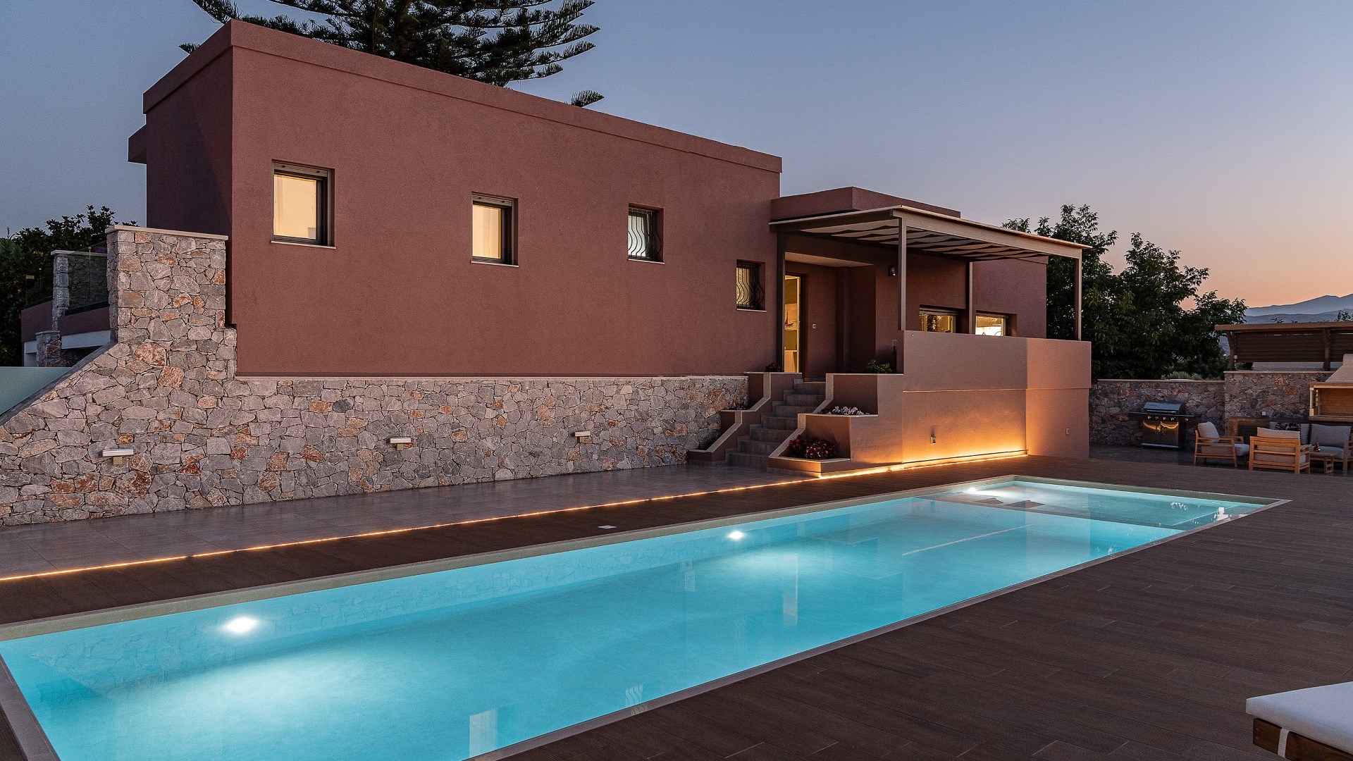Villa Enny, a modern villa of high aesthetic, constructed with top quality materials in every space and all the contemporary facilities, is the unique holiday retreat that all guests seek. Situated in a private fenced land in Agia village, only 15 min. drive from Chania city, it combines the tranquility of nature with luxurious holidays. The grand heated pool with children's section, the gas and charcoal BBQ, the playground, the high-quality interior and exterior furnishing are only some of the benefits of this one-of-a-kind villa!
